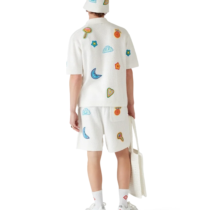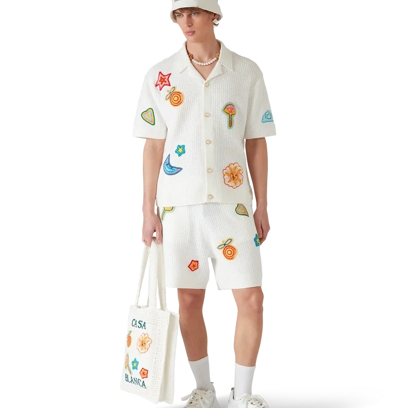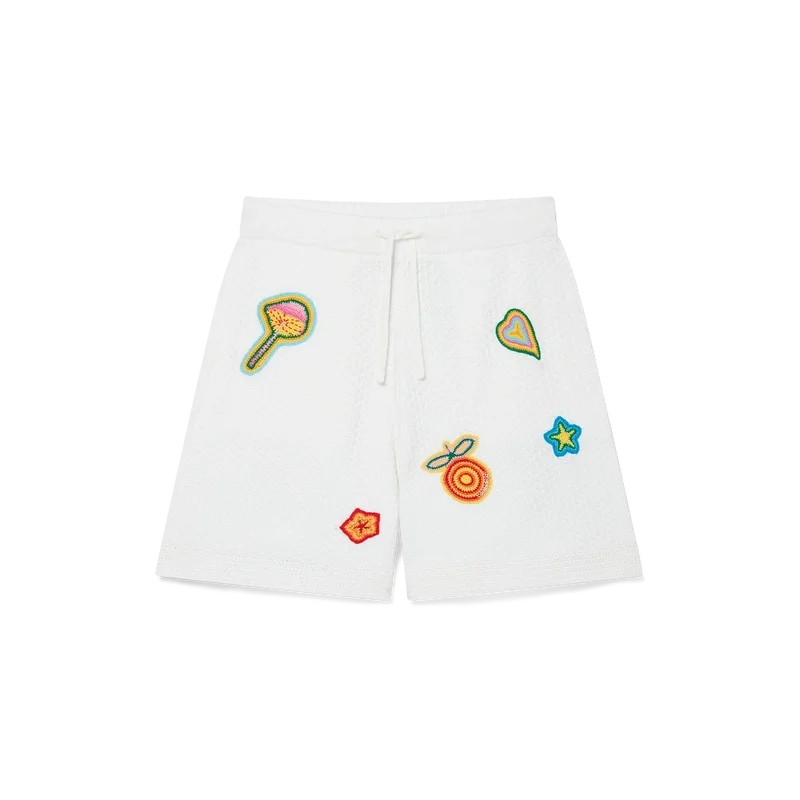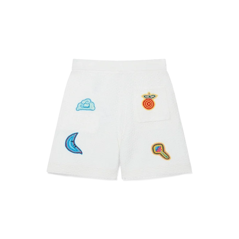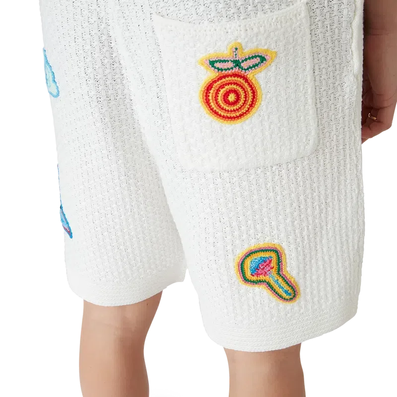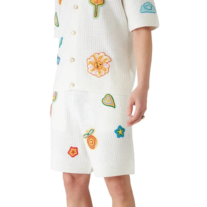 Die Shorts mit Häkelmotiven sind ein knielanges Modell aus merzerisiertem Baumwollstoff mit Häkelmotiven. Sie sind mit Motiven der klassischen Designelemente des Hauses, einem elastischen Bund, einem Kordelzugverschluss und schrägen Vordertaschen versehen.