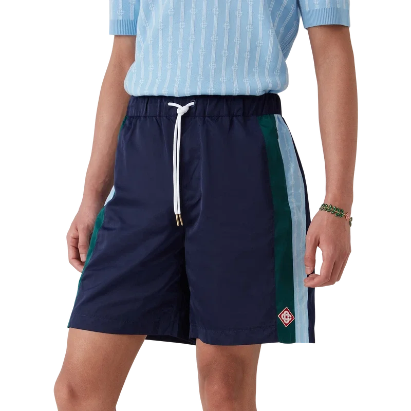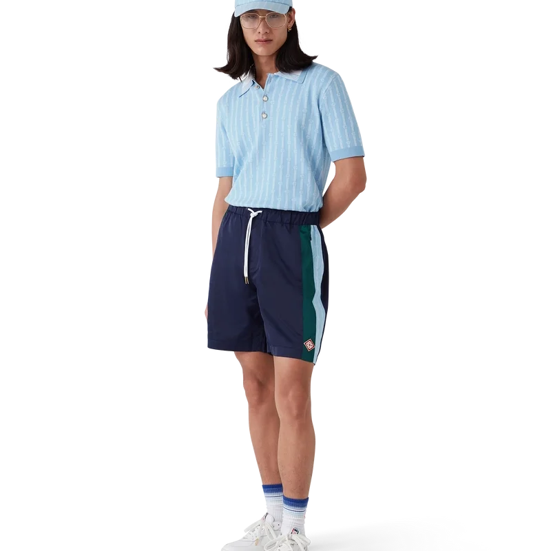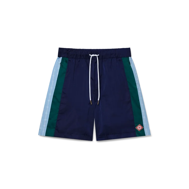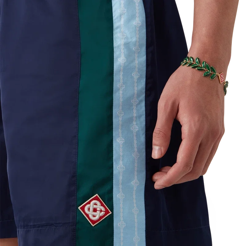 Die Laurel Stripe Track Shorts sind ein mittellanges Modell aus Funktionsstoff mit dem charakteristischen Diamant-Logo des Hauses. Mit elastischem Bund, Kordelzug mit goldenen Enden, seitlichen Eingrifftaschen mit Reißverschluss, Streifen-Detail an den Seiten und einer aufgesetzten Gesäßtasche mit Reißverschluss.