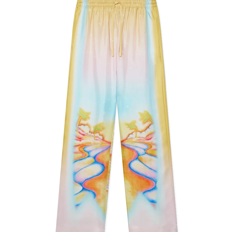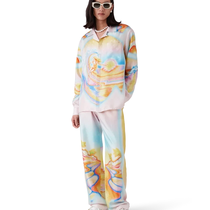 Die Seidenhose „Psychedelic Nirvana“ ist ein durchgehend bedrucktes Modell aus Seidentwill, dessen Design von den Airbrush-Motiven kalifornischer Surfbretter der 70er Jahre inspiriert ist. Die pastelligen Farben verleihen dem Druck eine fast traumhafte, idealistische Anmutung. Die Hose verfügt über einen elastischen Bund, einen Kordelzug, Seitentaschen in den Beinen und eine aufgesetzte Gesäßtasche.