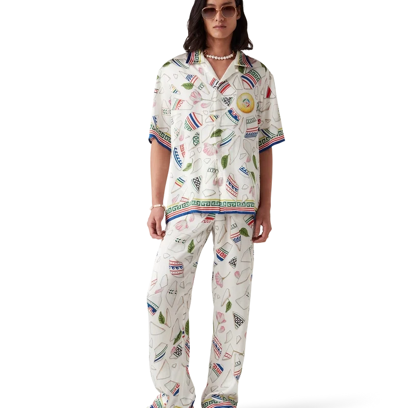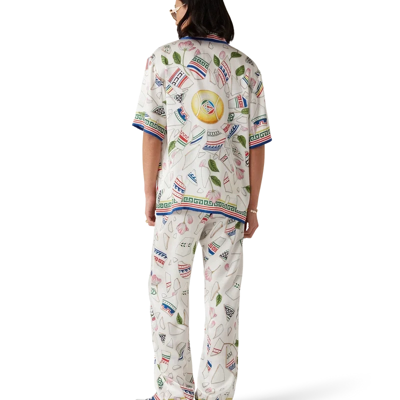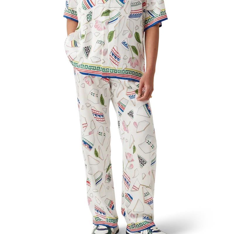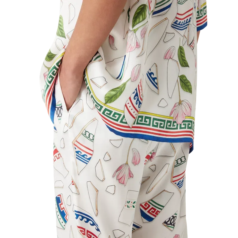 Die Seidenhose „Le Vase Brise“ ist ein durchgehend bedrucktes Modell aus Seidensatin mit dem saisonalen Print des Hauses, inspiriert von der fortwährenden Auseinandersetzung mit der klassischen Schönheit und dem zeitgenössischen Charme des antiken Griechenlands. Abgerundet durch einen elastischen Bund, Seitentaschen in den Beinen, eine aufgesetzte Gesäßtasche, einen Kordelzugverschluss und ein vom griechischen Schlüsselmuster inspiriertes Detail am Saum.