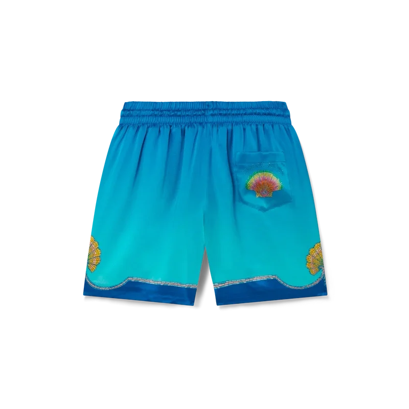 Die Seidenshorts „Coquillage Colora“ sind ein kurzes Modell mit einem durchgehenden Print, der das „Gradient Mosaic Rainbow Shell“-Motiv auf einem bekannten blauen Ombré-Seidentwill zeigt. Abgerundet durch einen elastischen Bund, einen Kordelzug, Seitentaschen, eine Gesäßtasche und kontrastierende Saumdetails.