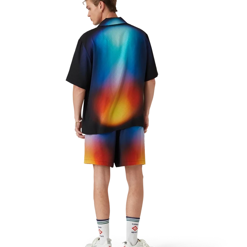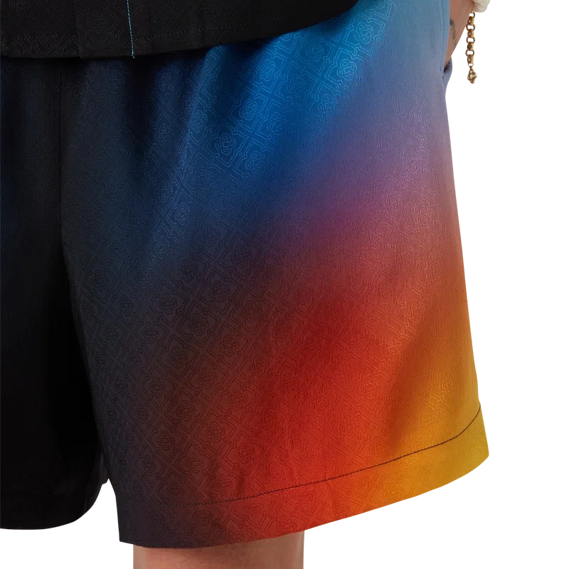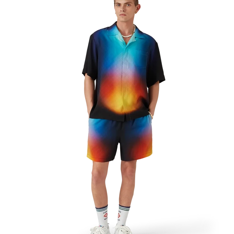 Die Seidenshorts mit Farbverlauf sind ein bedrucktes Design mit den Farbverläufen der Saison, gefertigt aus Seidenstoff. Mit elastischem Bund, Kordelzug, Seitentaschen in den Nähten und einer aufgesetzten Gesäßtasche. Entworfen, um mit dem passenden Seidenhemd mit Farbverlauf getragen zu werden.