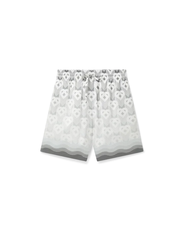 Die Seidenshorts mit Herz-Monogramm im Farbverlauf sind mit einem Allover-Print versehen, der das Herz-Monogramm des Hauses auf dem silbernen Farbverlaufshintergrund dieser Saison zeigt. Sie sind aus Monogramm-Seidensatin gefertigt und mit einem elastischen Bund, einem Kordelzugverschluss, Seitentaschen in den Beinen, einer aufgesetzten Gesäßtasche und einem vom Memphis-Wave-Stil inspirierten Saumdetail im Farbverlauf versehen.