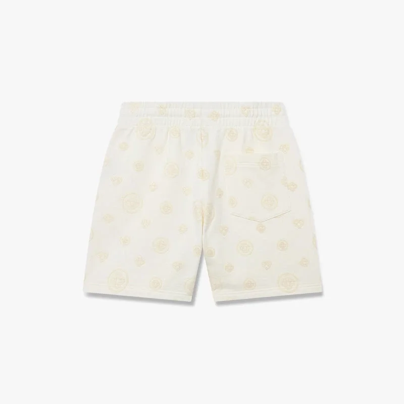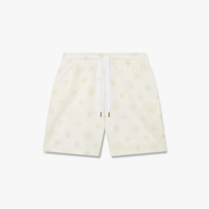 Die Sweatshorts mit Applikation und cremefarbenem Monogramm haben einen lockeren Schnitt und sind mit dem ikonischen Monogram-Casablanca-Logo des Hauses bedruckt. Sie verfügen über einen elastischen Bund, einen Kordelzug, Seitentaschen in den Säumen, ein Futter und eine aufgesetzte Gesäßtasche.