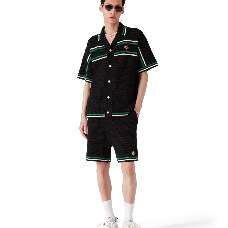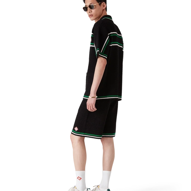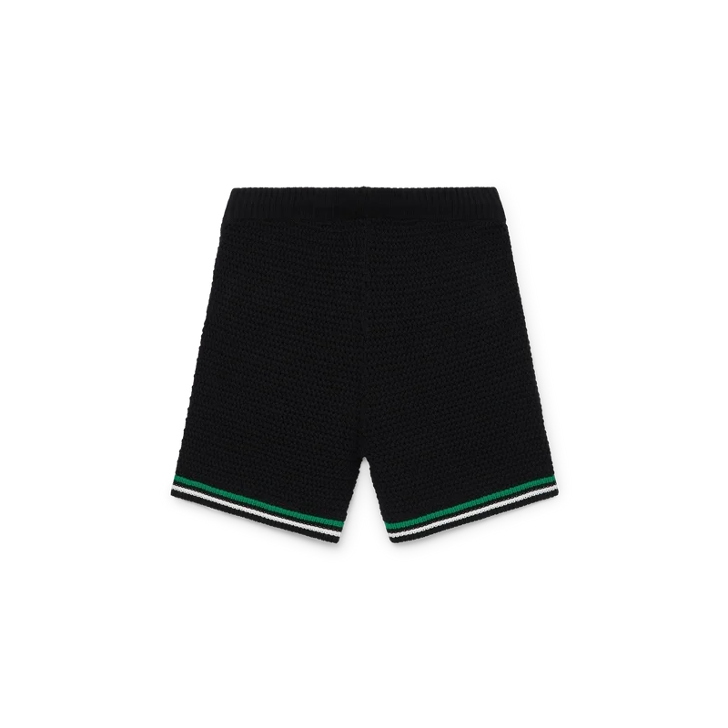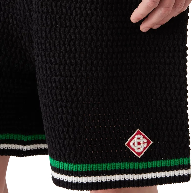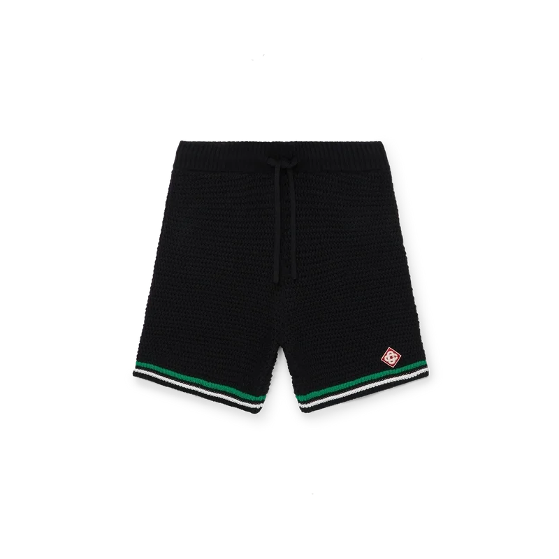 Die Tennis-Häkel-Shorts sind ein weich strukturiertes Design aus gestricktem Baumwollstoff mit dem charakteristischen Rautenlogo des Hauses. Mit kontrastierendem weißem, geripptem Gummibund, Kordelzug und Kantenverzierung sowie grün-weißen Streifen am Saum.