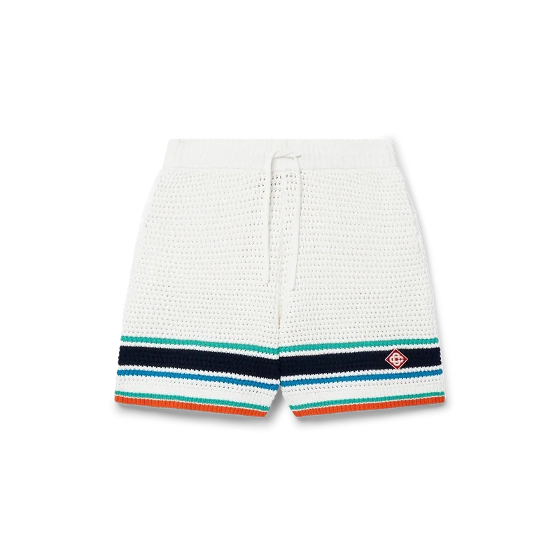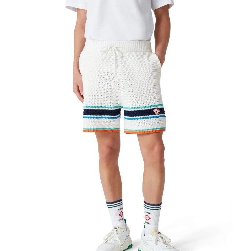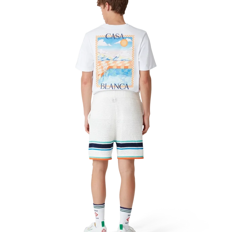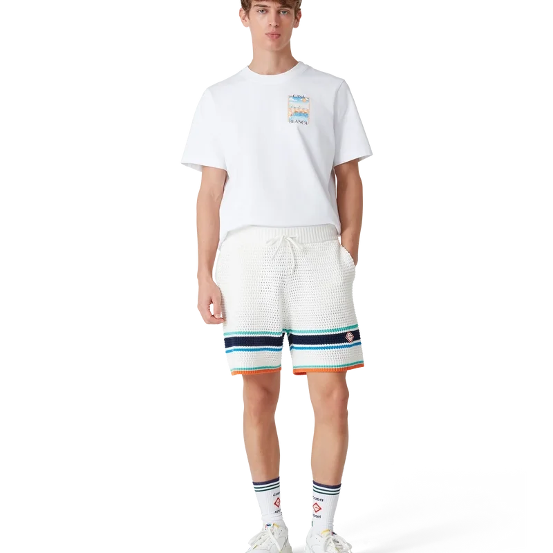 Die Tennis-Shorts im Häkel-Look sind ein Design mit weicher Textur aus gestricktem Bio-Baumwollstoff und tragen das charakteristische Rautenlogo des Hauses, das an das Reise- und Urlaubsthema der Kapselkollektion anknüpft. Sie sind mit einem gerippten, elastischen Bund mit Kordelzug, Seitentaschen und kontrastierenden Streifen am Saum versehen.