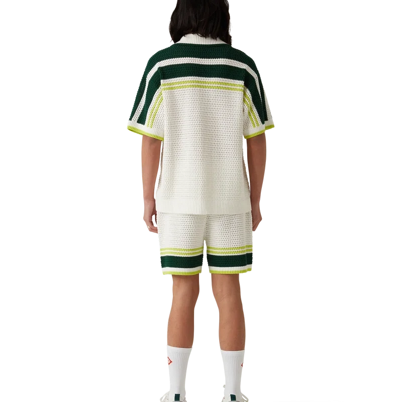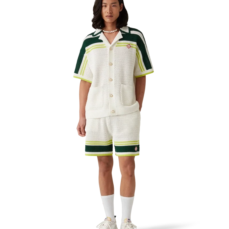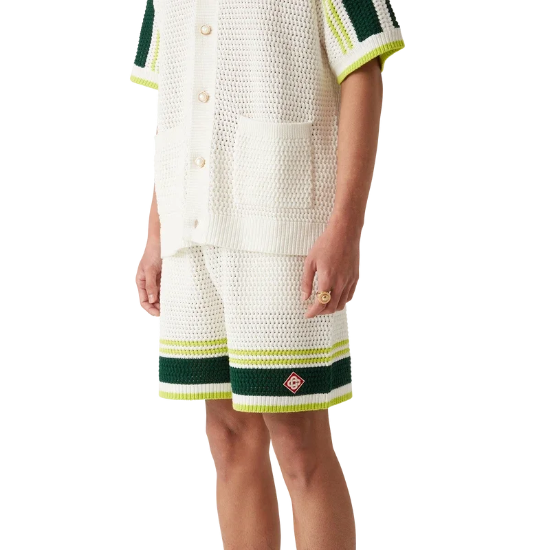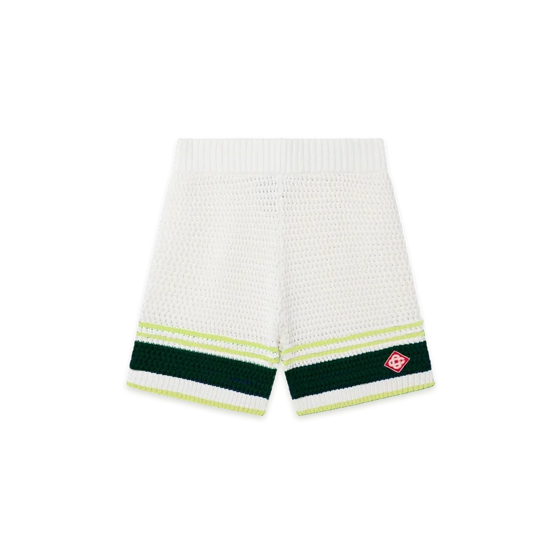 Die Tennis-Häkel-Shorts sind ein weich strukturiertes Design aus gestricktem Baumwollstoff mit dem charakteristischen Rautenlogo des Hauses. Mit geripptem, elastischem Bund mit Kordelzug, Seitentaschen und kontrastierenden Streifen an den Beinen.