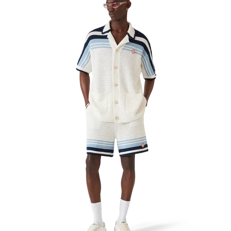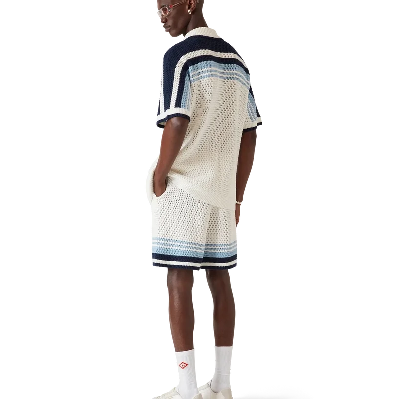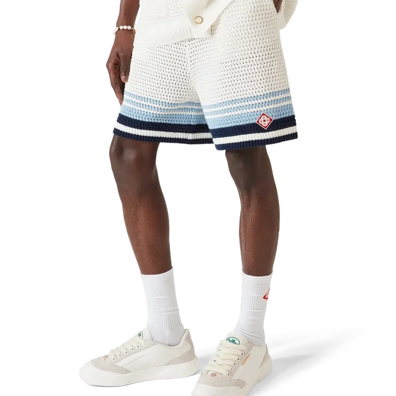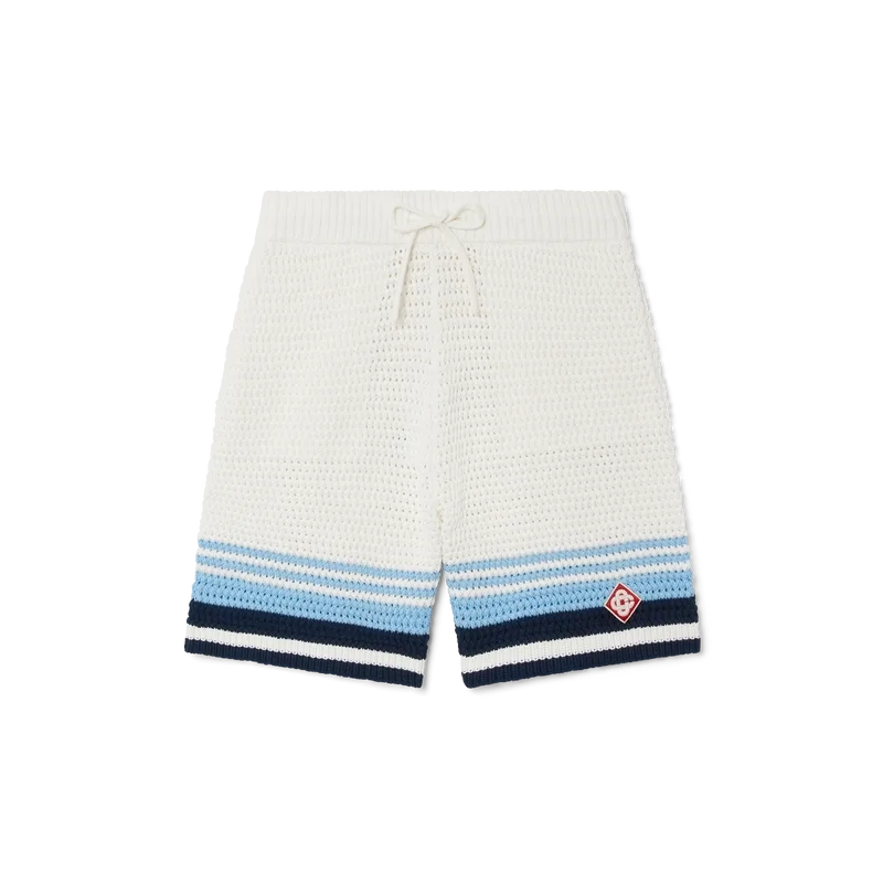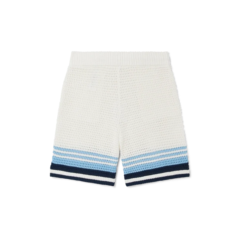 Die Häkel-Shorts sind ein raffiniertes Design mit weicher Textur aus einem gehäkelten Baumwollstoff und zeichnen sich durch das charakteristische Tennis-Streifenmuster in Naturfarben aus, das einen Farbverlaufseffekt erzeugt. Mit geripptem, elastischem Bund mit Kordelzug, Seitentaschen und einer lockeren Silhouette.