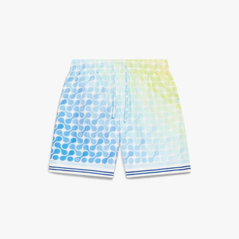 Die Tennis Tile Seidenshorts zeichnen sich durch ein raffiniertes Design aus, das das saisonale Motiv mit einem wellenförmigen Muster aus sich kreuzenden Logos und Tennisbällen auf einem saisonalen Farbverlaufshintergrund zeigt. Abgerundet durch einen elastischen Bund, einen Kordelzug, Seitentaschen in den Beinen, eine aufgesetzte Gesäßtasche und gestreifte Saumdetails.