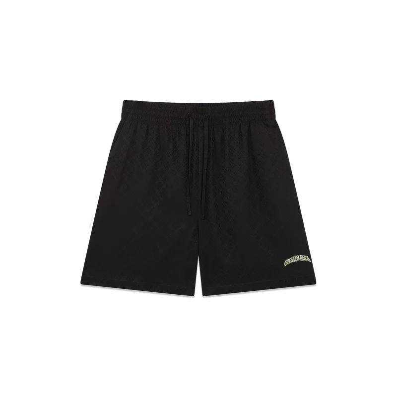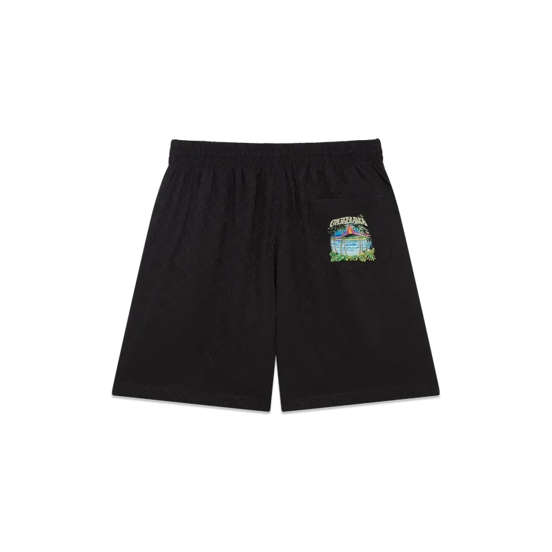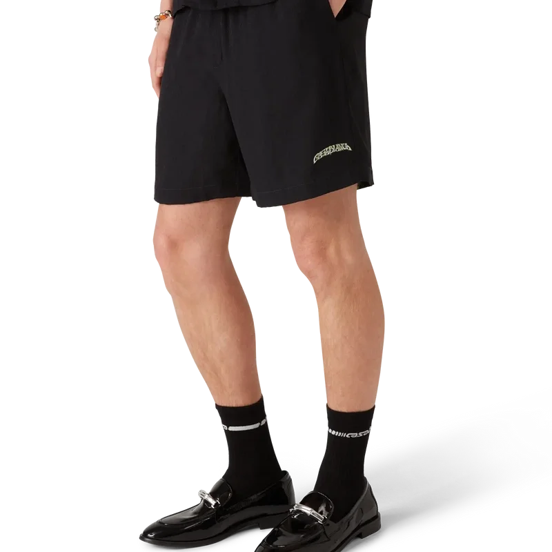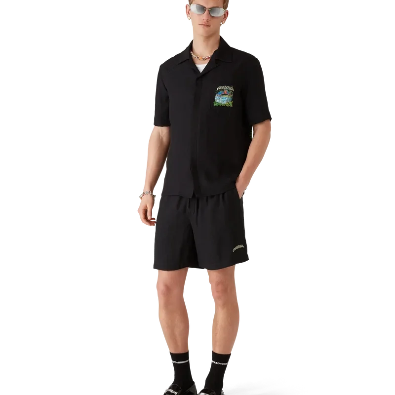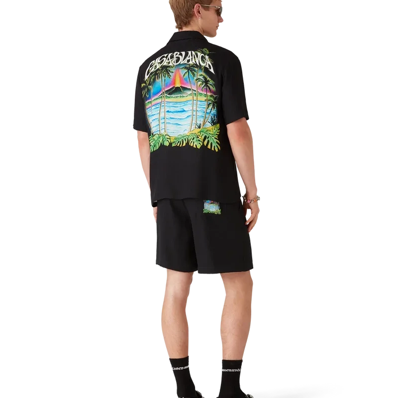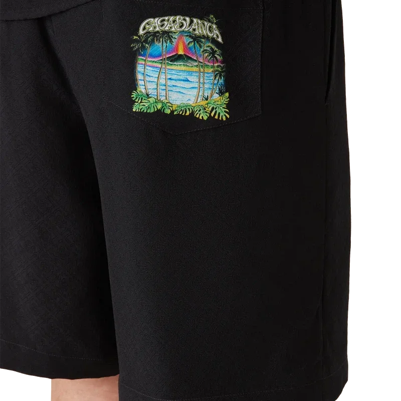 Die Volcano-Seidenshorts zeichnen sich durch ein raffiniertes Design aus, das das saisonale Motiv eines Vulkans zeigt, der sich dramatisch hinter halb silhouettierten Palmen abzeichnet, mitten in einem Ausbruch, wobei seine feurige Energie in scharfem Kontrast zu der ruhigen, friedlichen Szene im Vordergrund steht. Abgerundet durch einen elastischen Bund, einen Kordelzug, Seitentaschen in den Beinen, eine aufgesetzte Gesäßtasche und eine lockere Silhouette, die den luxuriösen Ansatz der Marke für Freizeitkleidung widerspiegelt.