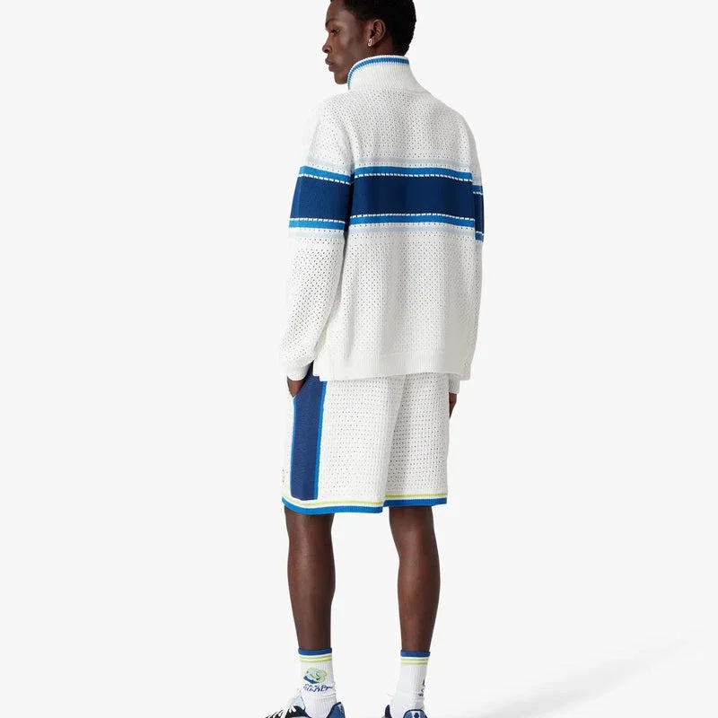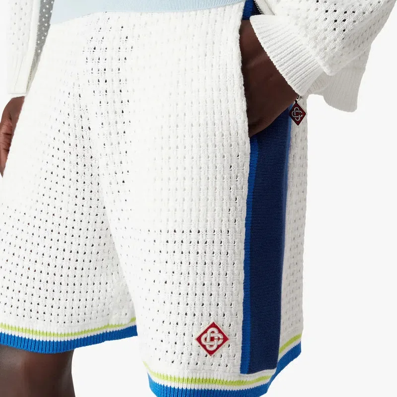 Die weiß-blauen Häkel-Shorts sind ein raffiniertes Design aus offen gewebtem Stoff mit Streifen an den Seiten. Abgerundet durch einen elastischen Bund, einen Kordelzug, seitliche Eingrifftaschen und gestreifte Kanten an den Beinen.