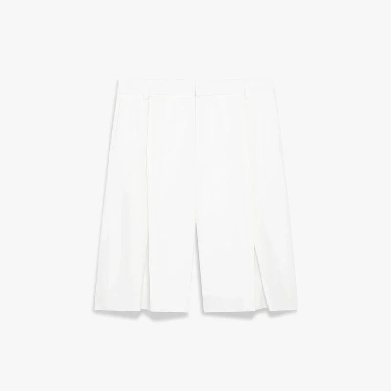 Die weißen, plissierten Baggy-Shorts sind ein raffiniertes, knielanges, maßgeschneidertes Design mit durchgehenden Plissee-Details. Abgerundet durch einen strukturierten Bund, Gürtelschlaufen, einen Reißverschluss, schräge Seitentaschen, Gesäßtaschen und eine lockere Silhouette.