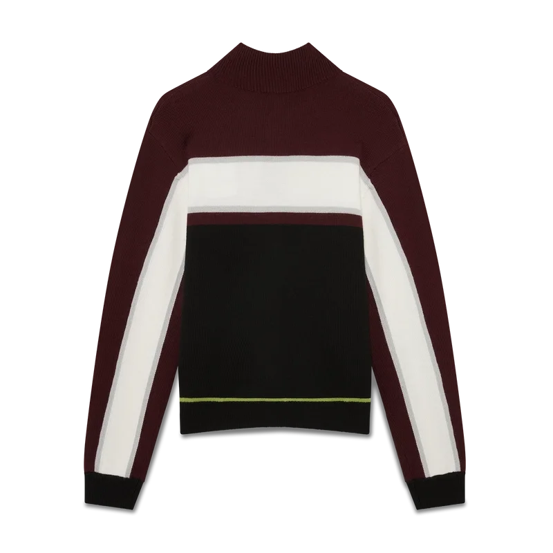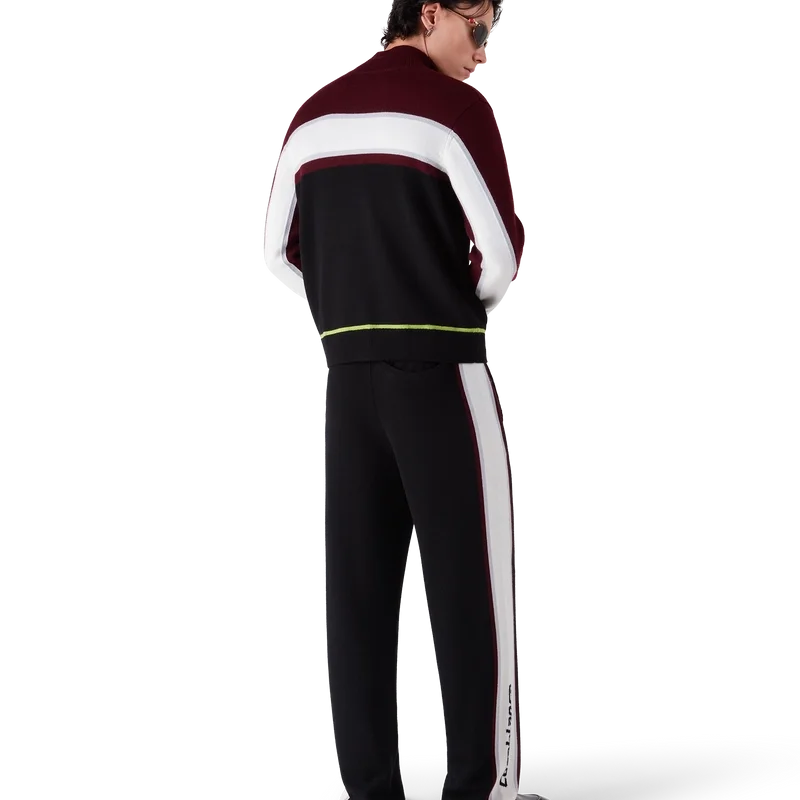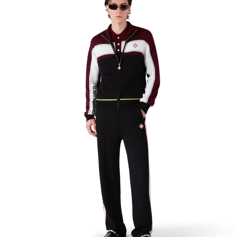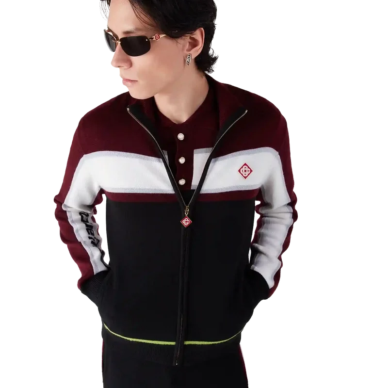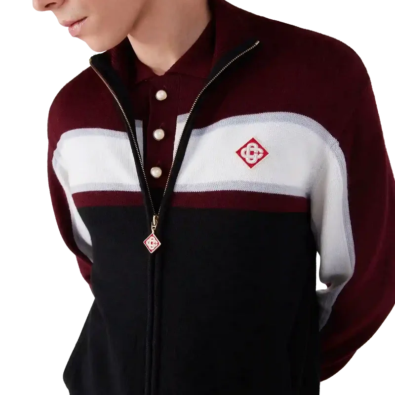 Die gestreifte Merino-Jacke ist ein raffiniertes Apras-Sport-Design mit strukturierter Strickkonstruktion. Sie verfügt über einen durchgehenden Reißverschluss mit dem charakteristischen Rautenlogo des Hauses, Streifenverzierungen auf Brust und Ärmeln, Casablanca-Branding und eine lockere Passform, die sportliche Leichtigkeit mit Couture-Flair verbindet.