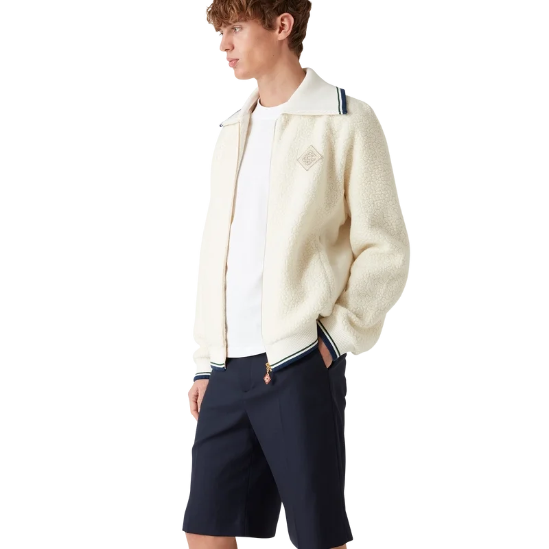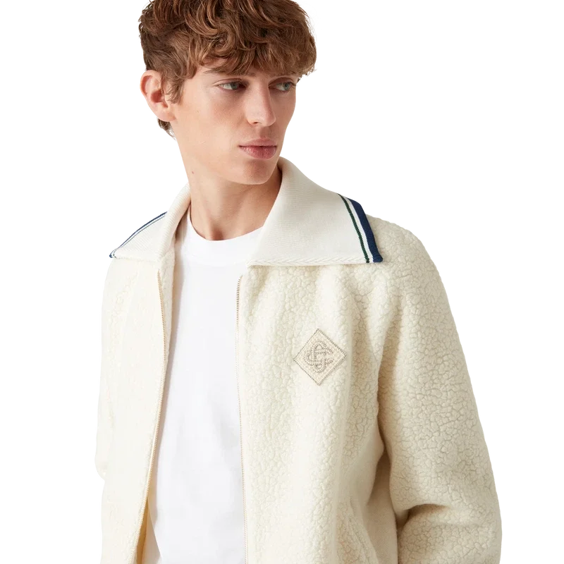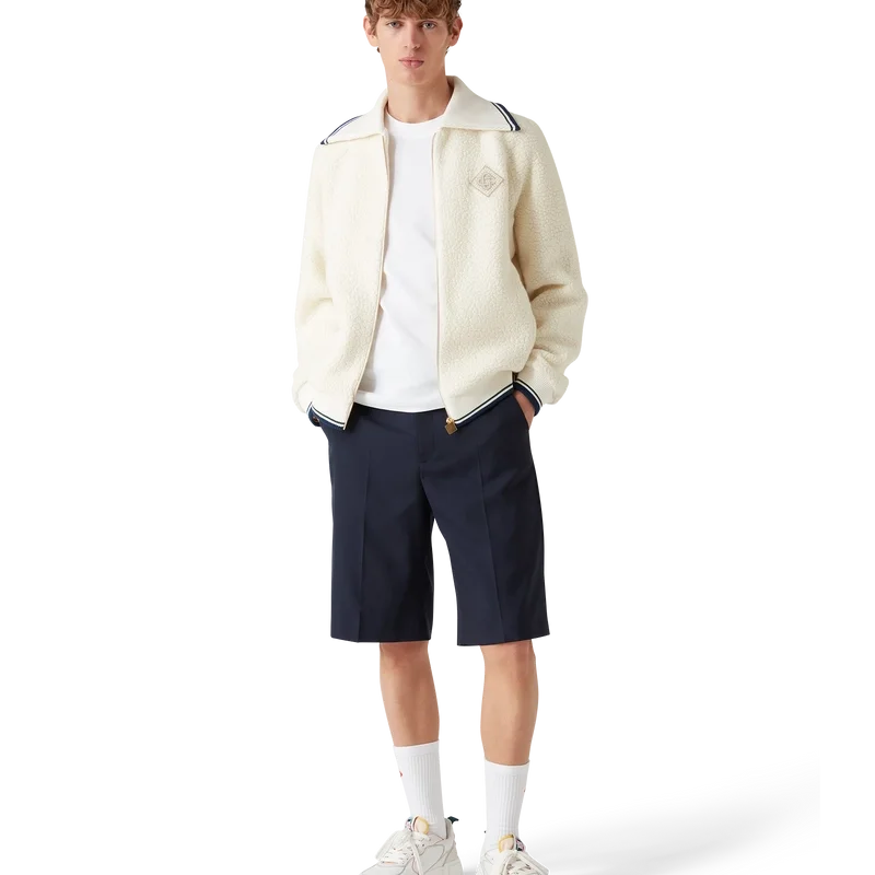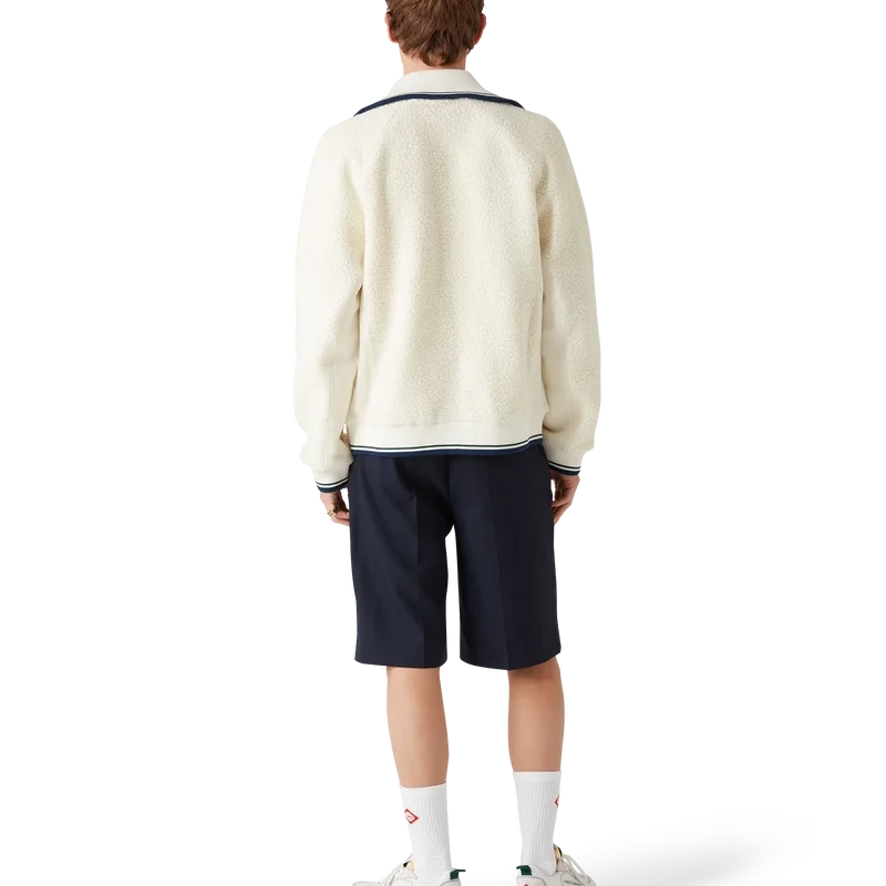 Der Kaschmir-Pullover mit Reißverschluss ist ein langärmeliges Modell aus einem Kaschmirmischgewebe. Er verfügt über einen Reißverschluss, das für diese Saison neu interpretierte Rautenlogo des Hauses, ein Futter, Seitentaschen sowie einen gerippten Kragen, Ärmelbündchen und Saum mit gestreiften Details.