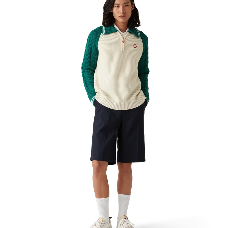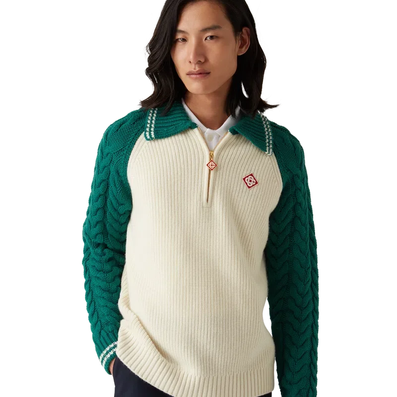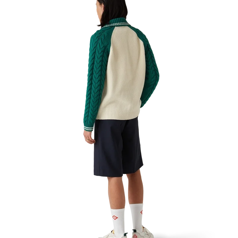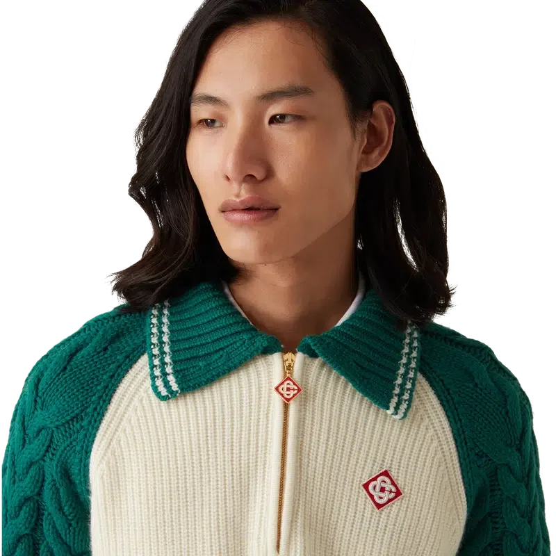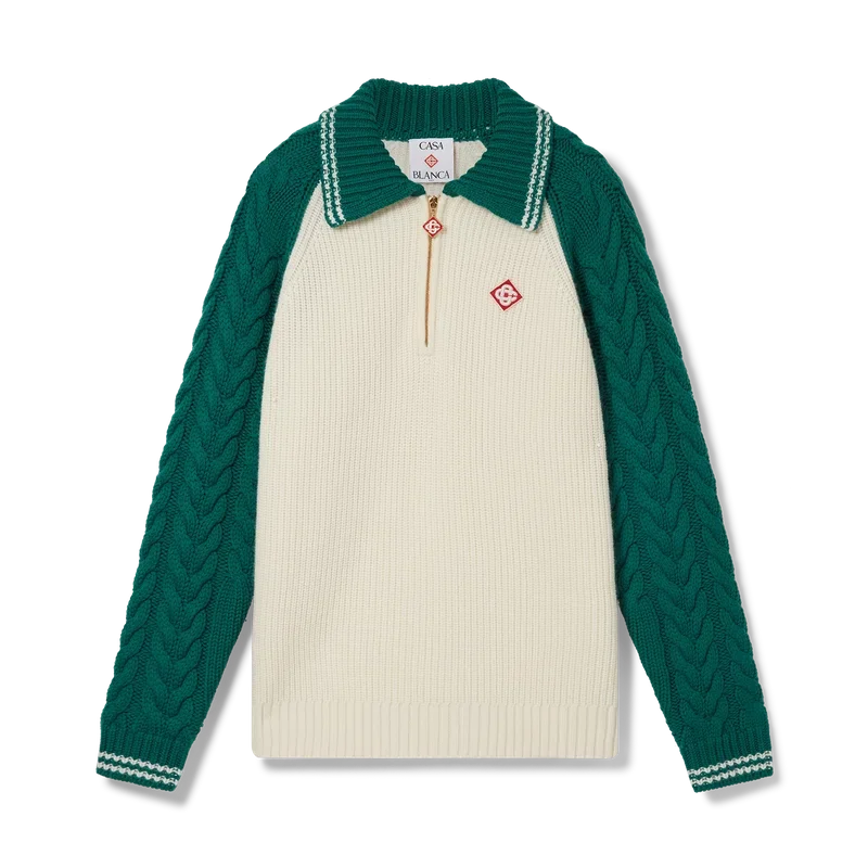 Der Kaschmir-Pullover mit Zopfmuster ist ein langärmeliges Modell mit Struktur, gefertigt aus einem Kaschmirmischgewebe. Er ist versehen mit dem charakteristischen Rautenlogo des Hauses, einem Viertelreißverschluss, geripptem Kragen, Bündchen und Saum, kontrastierendem Kragen sowie Raglanärmeln im Zopfmuster mit weißen Streifen an den Kanten.