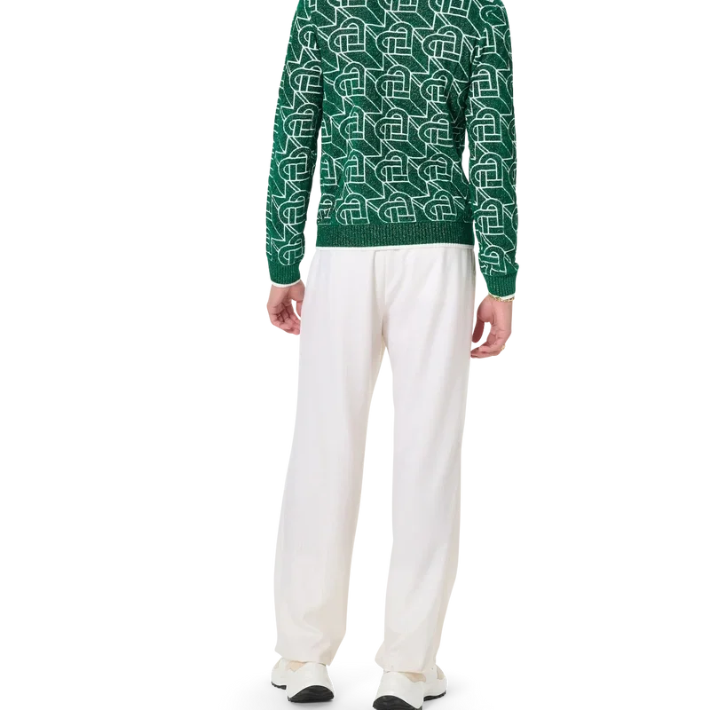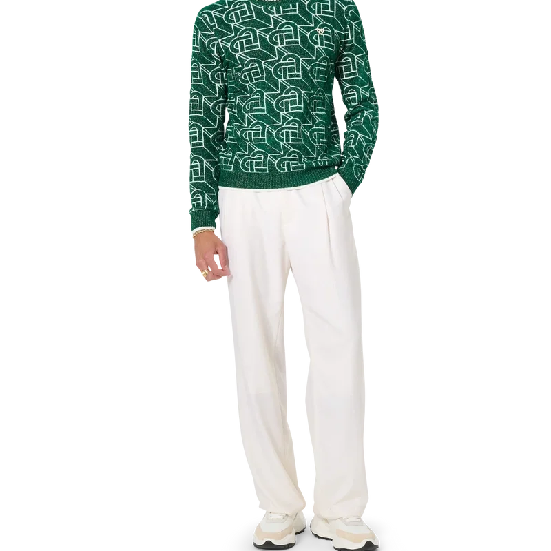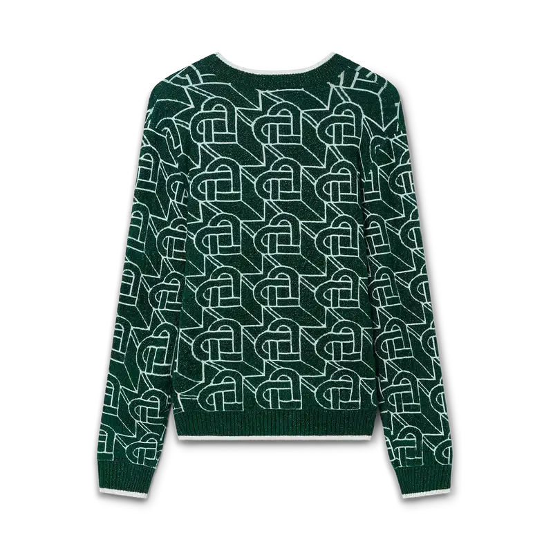 Der Pullover mit Herz-Monogramm ist ein langärmeliger Strickpullover mit dem charakteristischen, durchgehenden Herz-Monogramm-Design des Hauses mit goldenen Fadeneinlagen, veredelt mit dem emaillierten und vergoldeten Herz-Nietenverschluss des Hauses sowie einem Casablanca-Markenlabel.