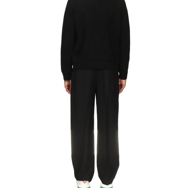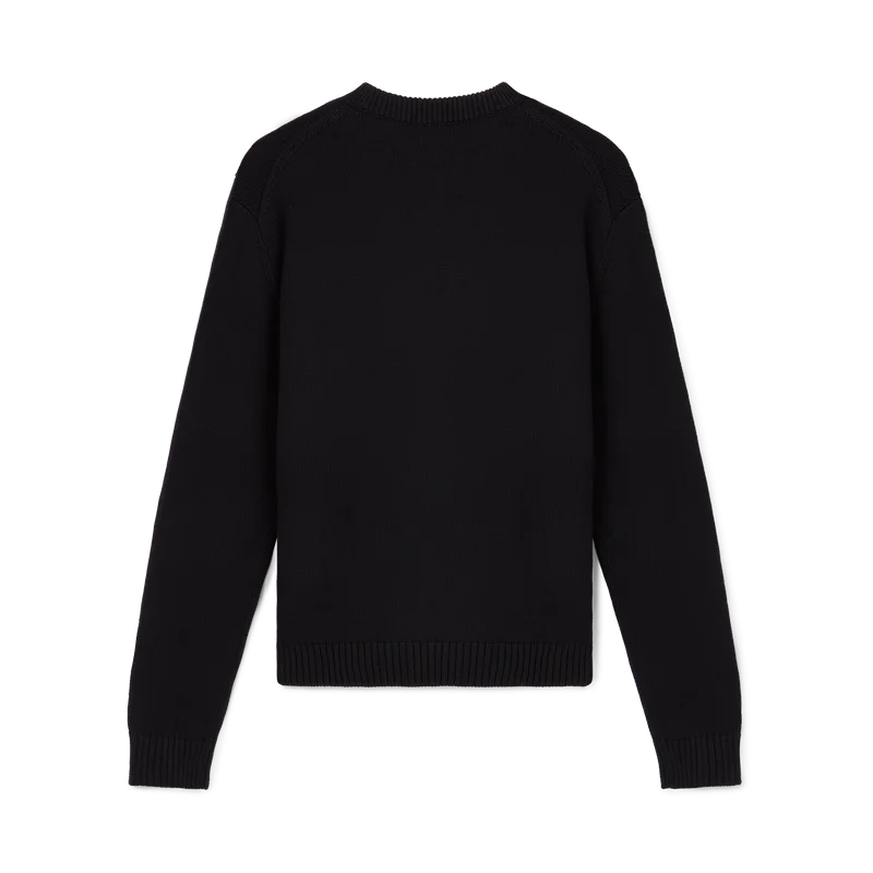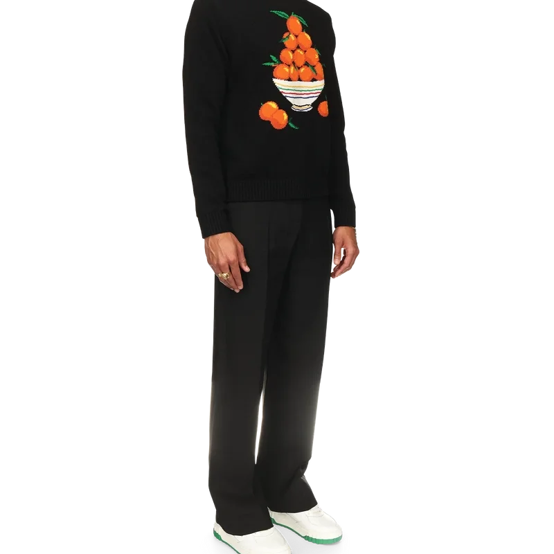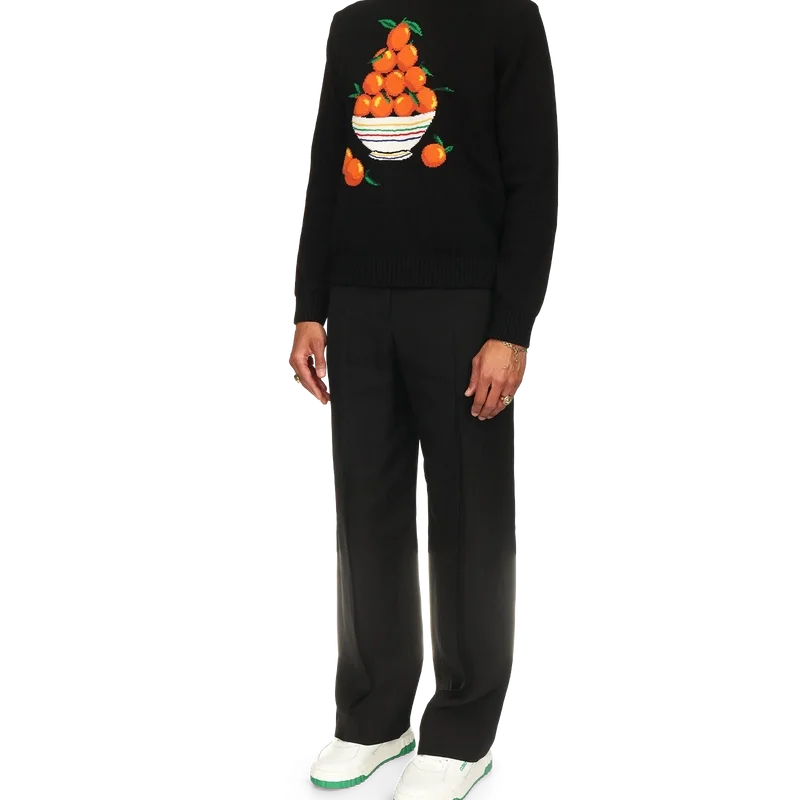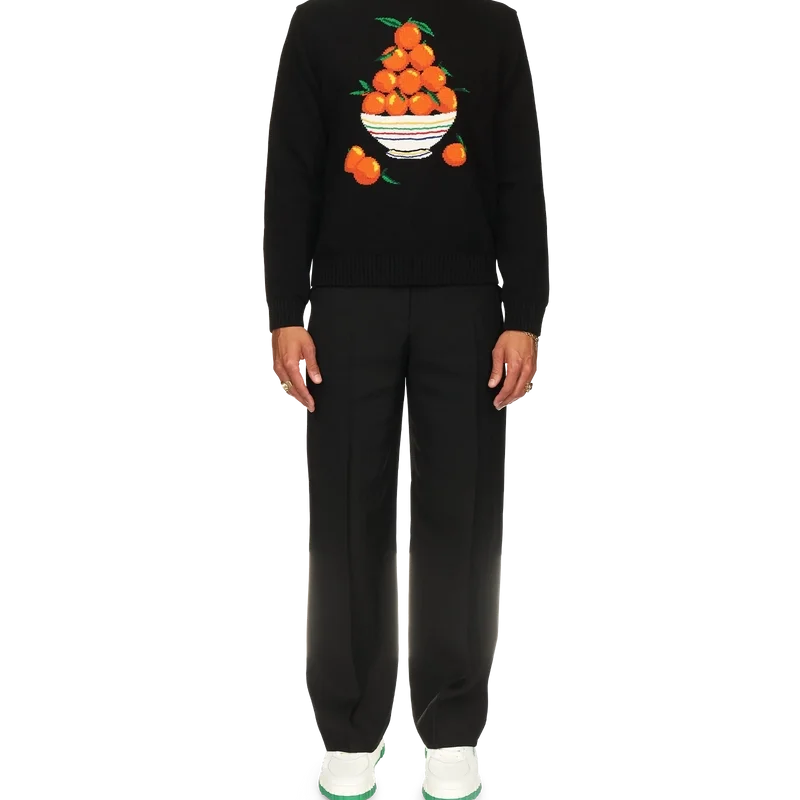 Der Pullover „Pyramide D’oranges“ ist aus 100 % Baumwollstrick gefertigt und mit dem ikonischen orangefarbenen Pyramidenmotiv des Hauses verziert. Er verfügt über einen gerippten Kragen, gerippte Bündchen und einen gerippten Saum sowie ein Label mit dem Casablanca-Logo.