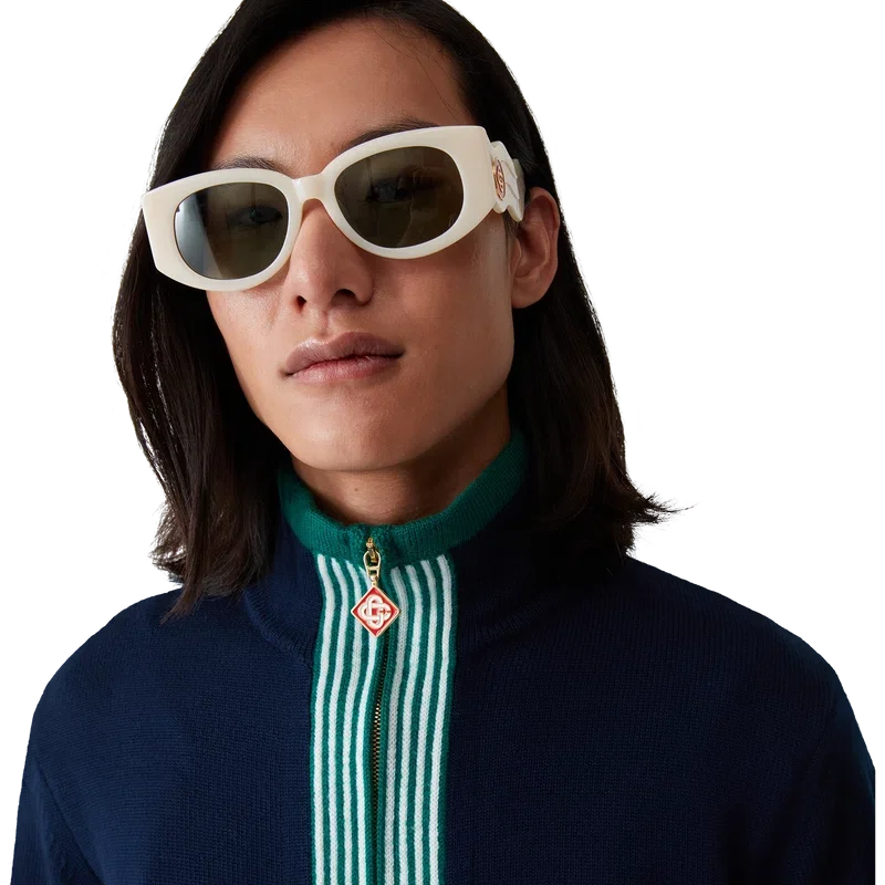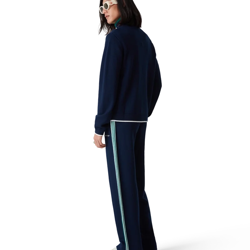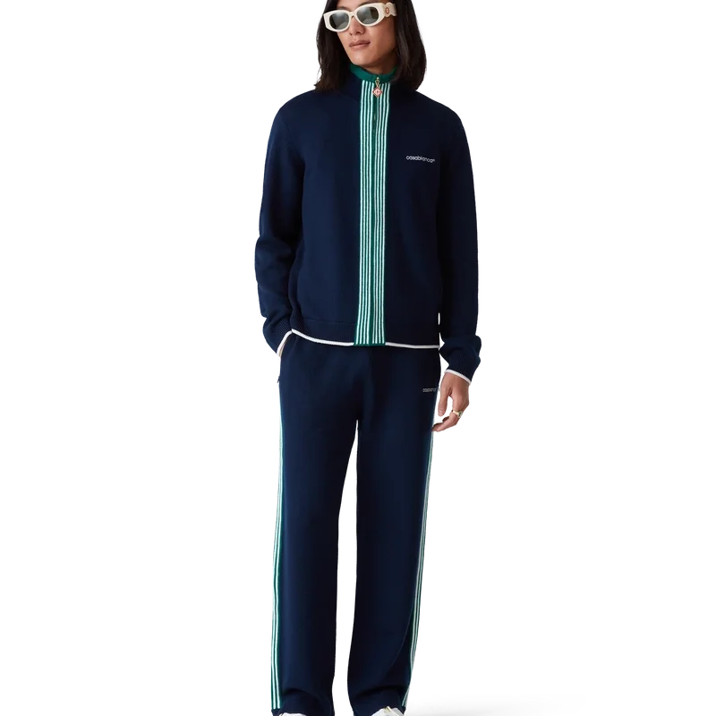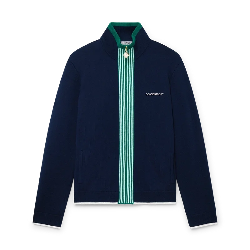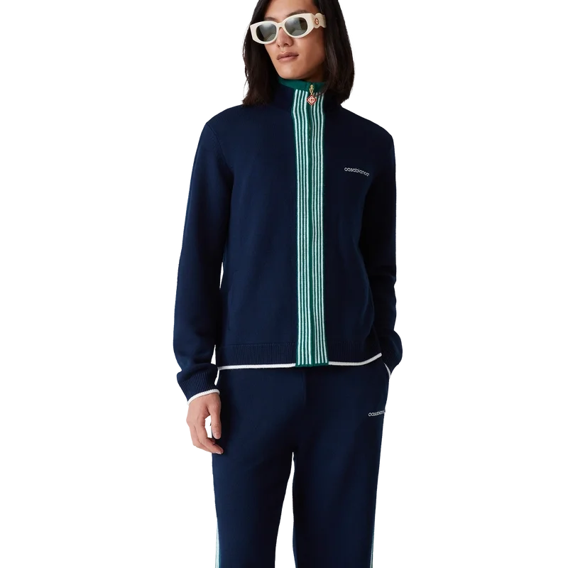 Die gestrickte Tennis-Trainingsjacke ist ein klassisches Design aus Merinowolle. Mit kontrastierenden Rippbündchen an Ärmeln, Saum, Knopfleiste und Stehkragen, Reißverschluss vorne und Casablanca-Logo.