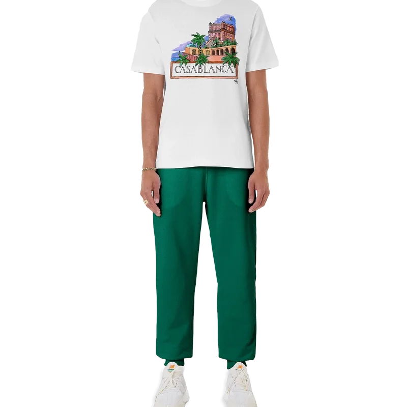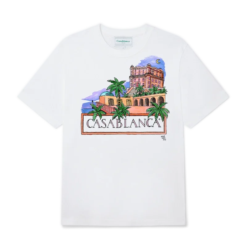 Das Amour Maroc T-Shirt aus Bio-Baumwolle zeigt eines der bekanntesten Kunstwerke der Marke, „Maison“, das erstmals 2019 vorgestellt wurde. Es verfügt über einen klassischen Rundhalsausschnitt, kurze Ärmel und ein Casablanca Paris-Markenlabel und ist für eine lockere Passform konzipiert.