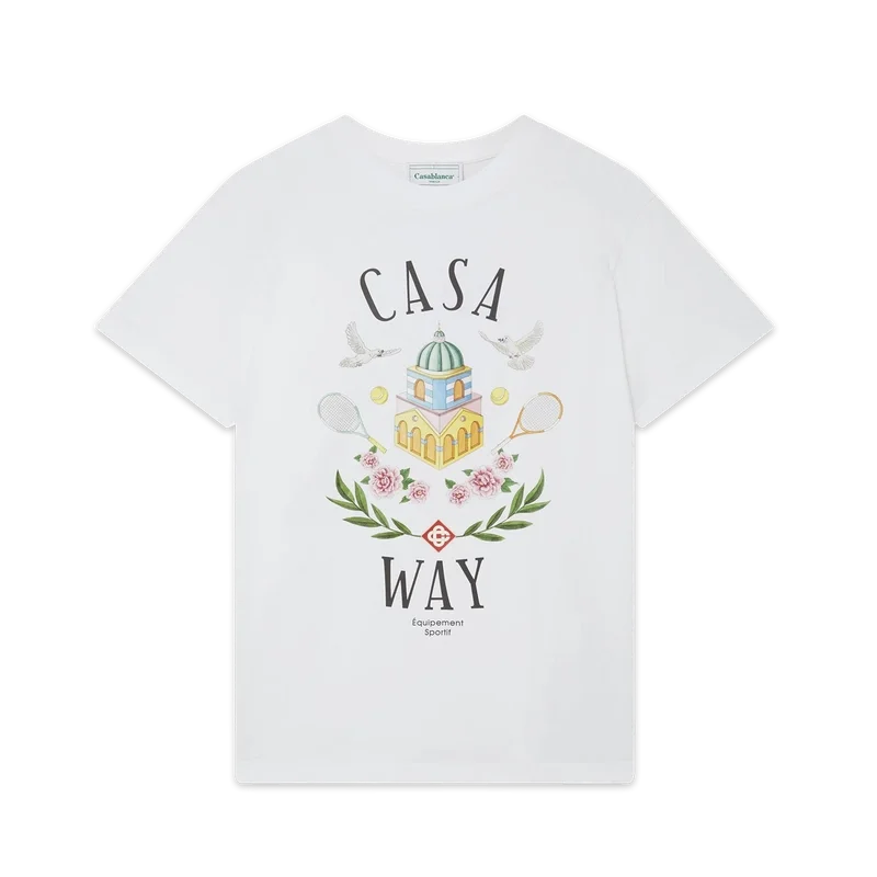 Das Casa Way T-Shirt aus Bio-Baumwolle mit Siebdruck zeigt eine saisonale Interpretation unseres charakteristischen Casa Way-Motivs. Mit klassischem Rundhalsausschnitt, kurzen Ärmeln und einem Casablanca Paris-Markenlabel, entworfen für eine lockere Passform.