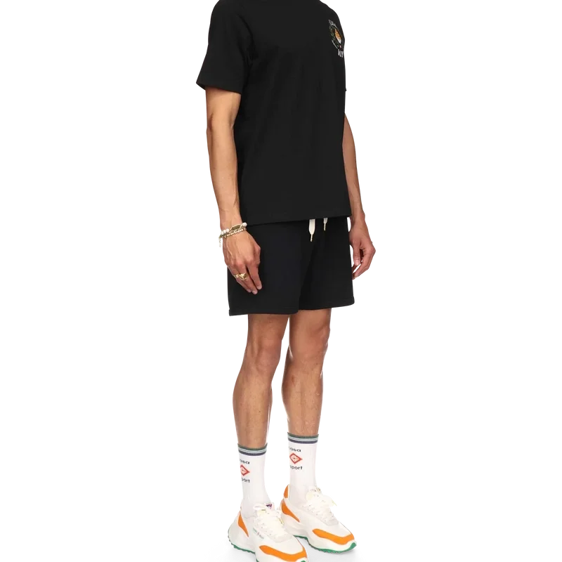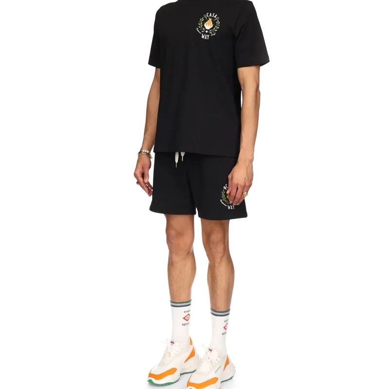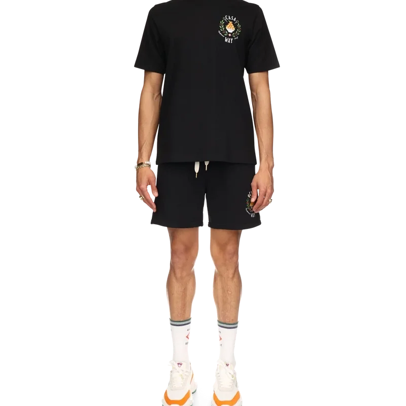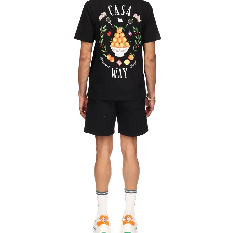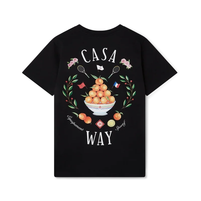 Das „Casa Way“-T-Shirt ist mit einem Aufdruck der klassischen ikonografischen Kunstwerke des Hauses verziert, darunter die orangefarbene Pyramide, Tennisschläger und ein Blumenmuster, das sich in einem größeren Aufdruck auf der Rückseite wiederholt. Es besteht aus 100 % Bio-Baumwolle und verfügt über einen klassischen Rundhalsausschnitt sowie ein Casablanca-Markenlabel.