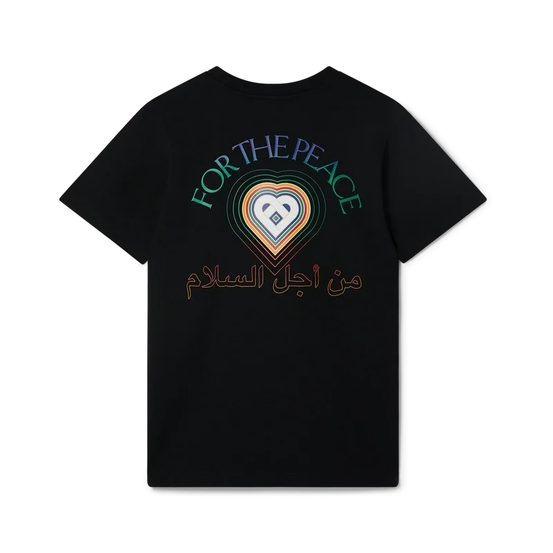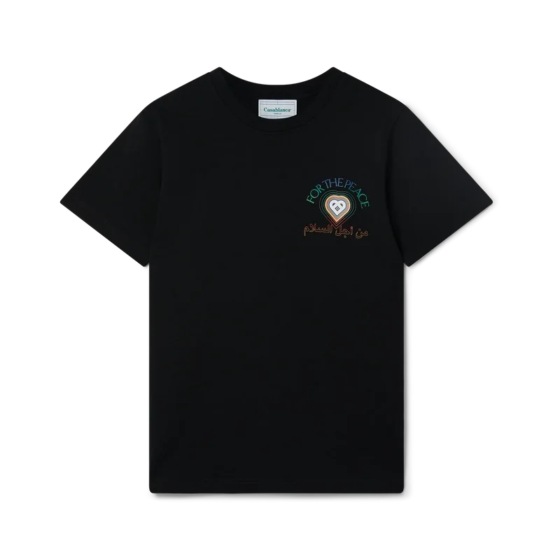 Das schwarze „For the Peace“-T-Shirt aus Bio-Baumwolle zeigt das saisonale Motiv „For the Peace“ – ein Zeugnis für alle, die gegen Unterdrückung jeglicher Art kämpfen und eine bessere Zukunft für alle ebnen. Mit klassischem Rundhalsausschnitt, kurzen Ärmeln und einem Casablanca Paris-Markenlabel, entworfen für eine lockere Passform.