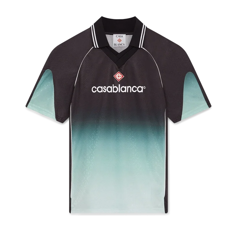 Das Jacquard-Fußballhemd mit Farbverlauf ist ein kurzärmeliges Modell im Farbdesign des Park Hyatt – eines legendären Tokioter Hotels, dessen Inneneinrichtung durch Mint und Schwarz geprägt ist – und besteht aus Jacquard-Monogrammstoff mit Farbverlauf. Abgerundet wird es durch den charakteristischen Diamant-Logo-Aufnäher des Hauses, einen gerippten Kragen und ein Casablanca-Logo auf der Brust.