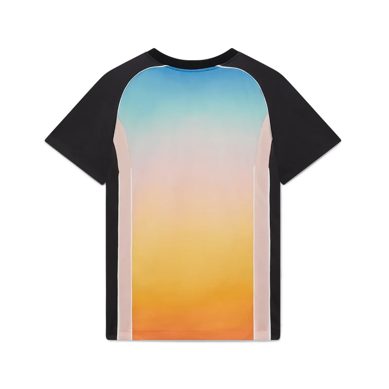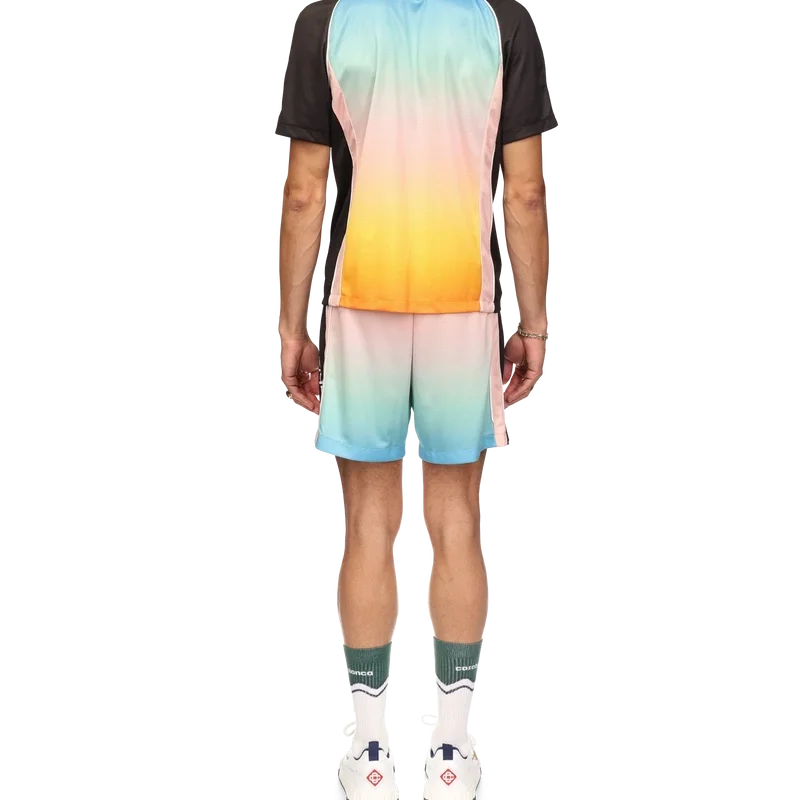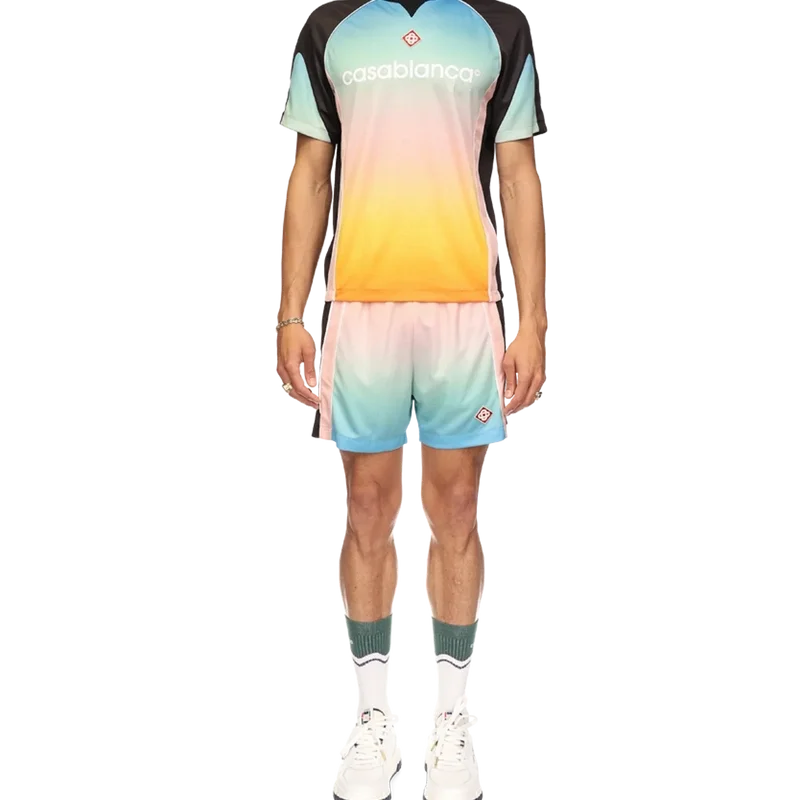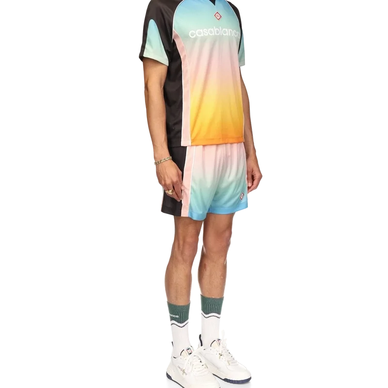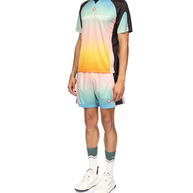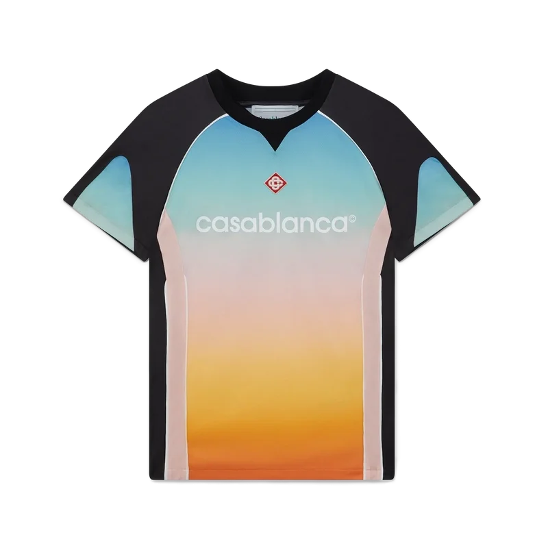 Das Fußball-Shirt mit Pastell-Farbverlauf ist ein kurzärmeliges Sportdesign mit einem Farbverlauf aus Pastelltönen, der die für unsere Marke zentralen ätherischen Themen unterstreicht. Es ist aus Birdseye-Mesh gefertigt und mit dem charakteristischen Diamant-Logo-Aufnäher des Hauses sowie dem Casablanca-Logo auf der Brust und einem klassischen Rundhalsausschnitt versehen.