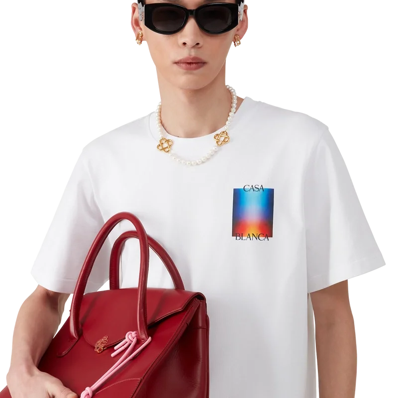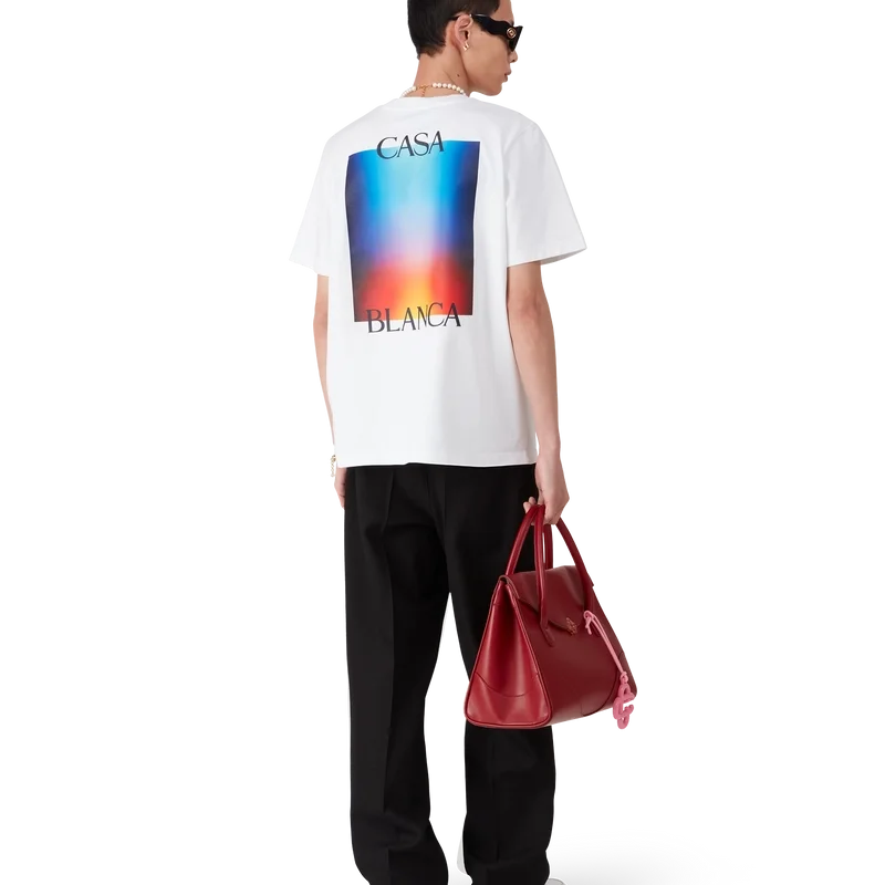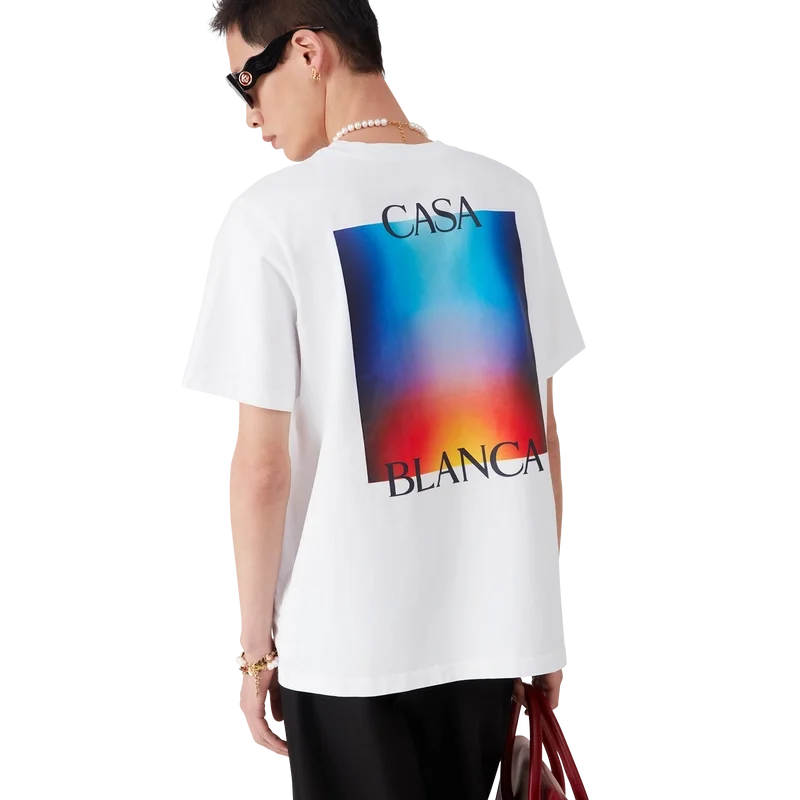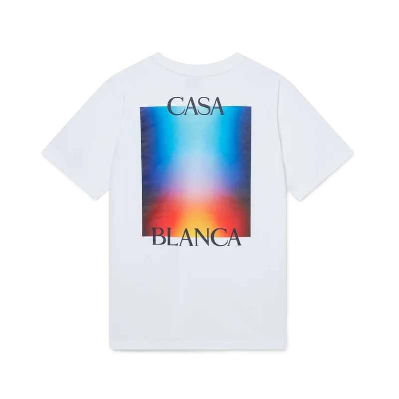 Das Gradient Casa Logo T-Shirt ist ein kurzärmeliges, bedrucktes Design aus Bio-Baumwolle mit dem saisonalen Farbverlauf des Hauses, inspiriert von einer futuristischen Interpretation des Casablanca-Farbverlaufs: eine Halo-Form, inspiriert von Vintage-Sci-Fi-Postern und Schallplatten. Abgerundet durch einen klassischen Rundhalsausschnitt.