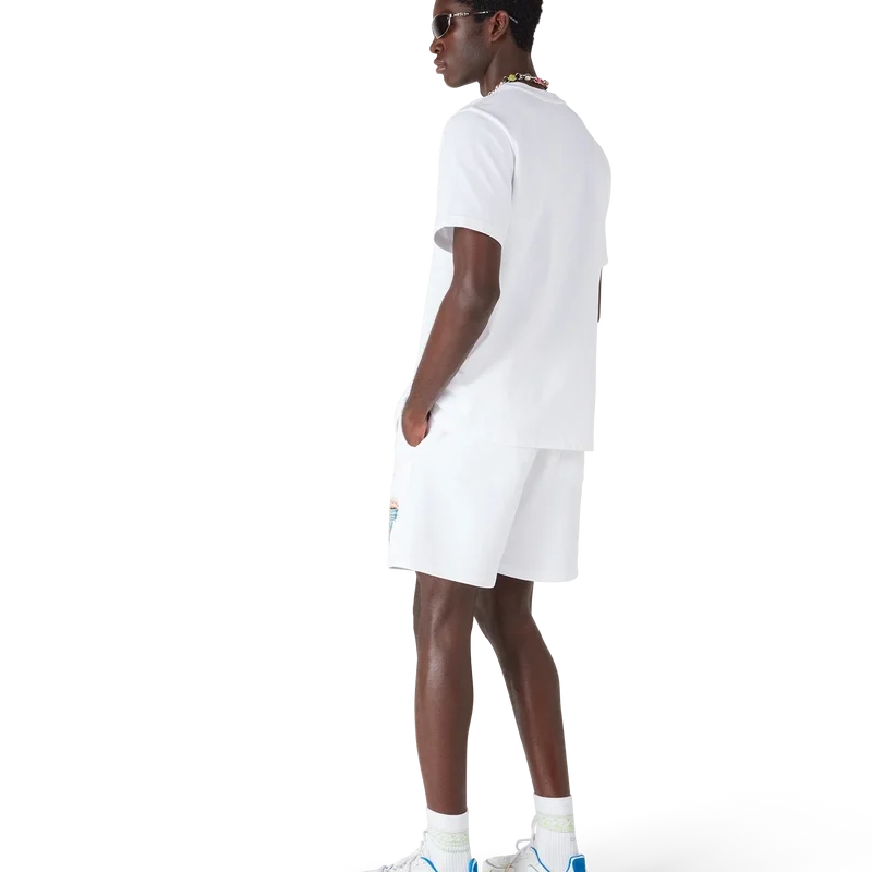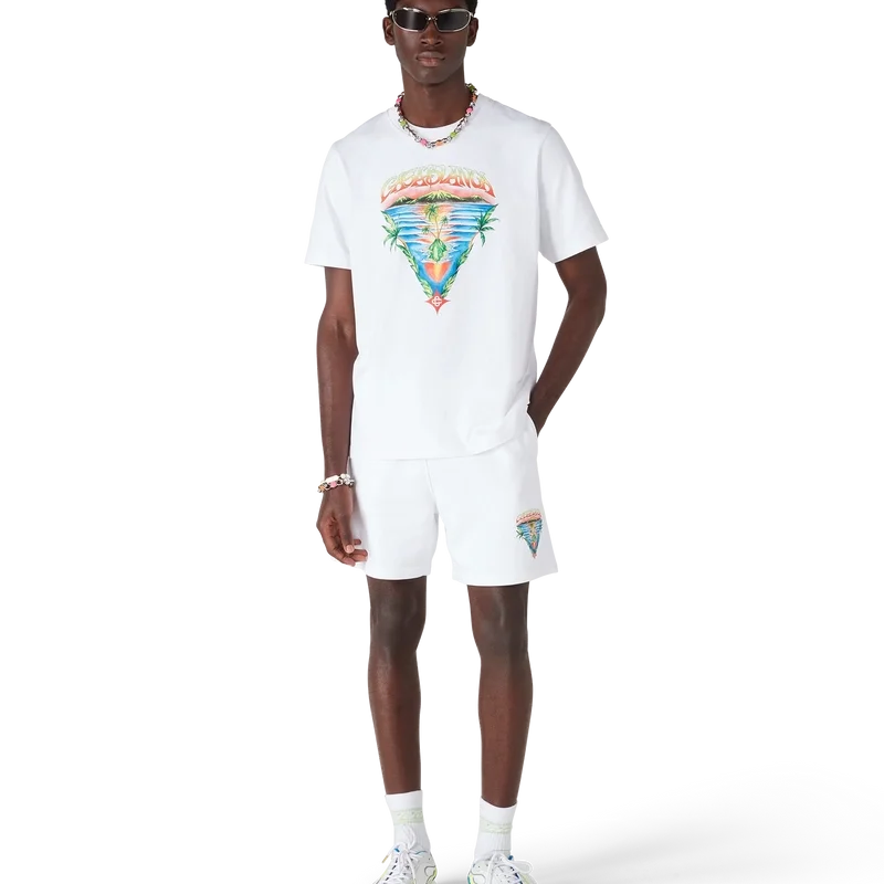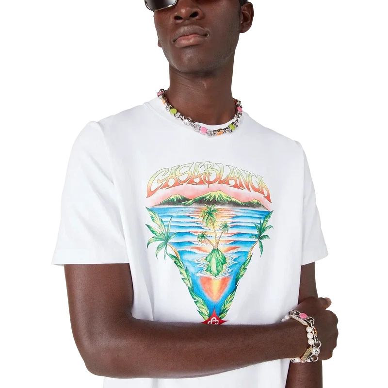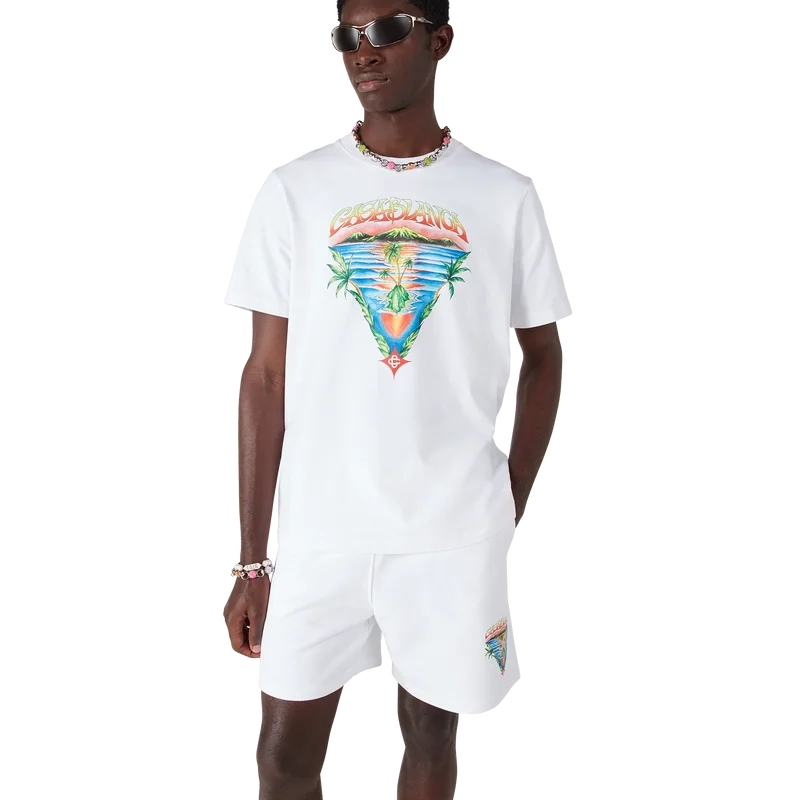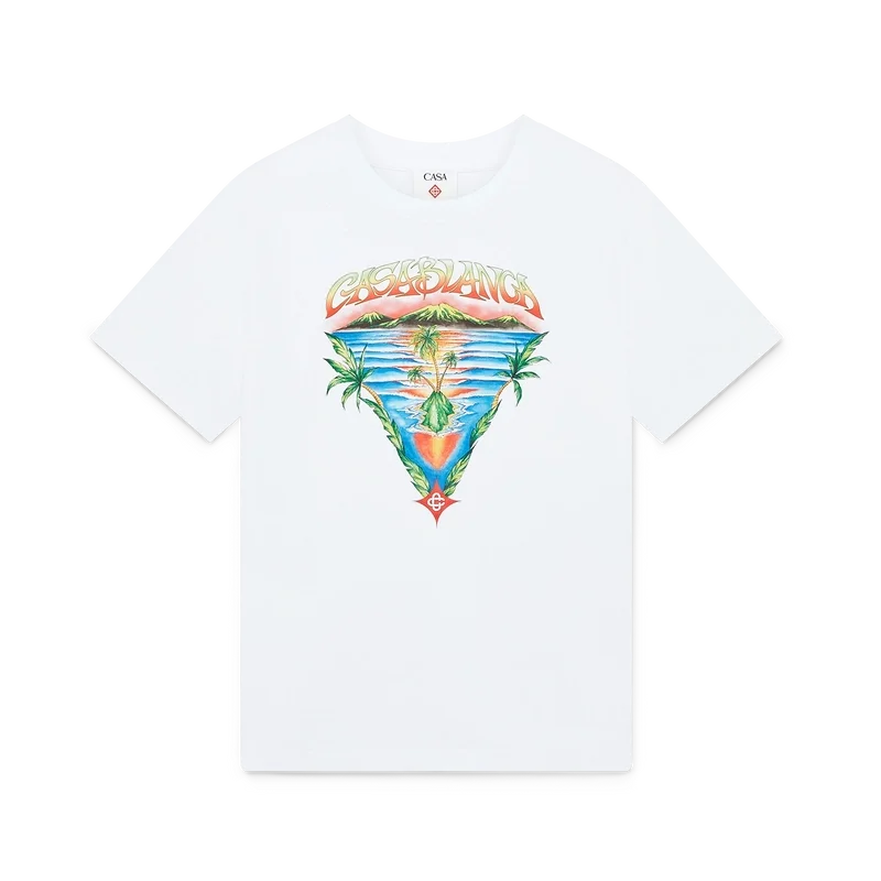 Das Innocence Triangle Classic T-Shirt zeigt eine Meereslandschaft bei Sonnenuntergang mit einer Insel im Zentrum, dargestellt in einem Stil, der von klassischer Surf-T-Shirt-Kunst beeinflusst ist. Das Motiv fängt die ätherische Schönheit der goldenen Stunde über tropischen Gewässern ein und präsentiert eine idealisierte Vision eines Strandparadieses durch die raffinierte Sport- und Freizeit-Perspektive des Hauses. Abgerundet durch einen Rundhalsausschnitt, kurze Ärmel und eine lockere Passform, die den raffinierten Ansatz des Hauses in Sachen Freizeitmode verkörpert.