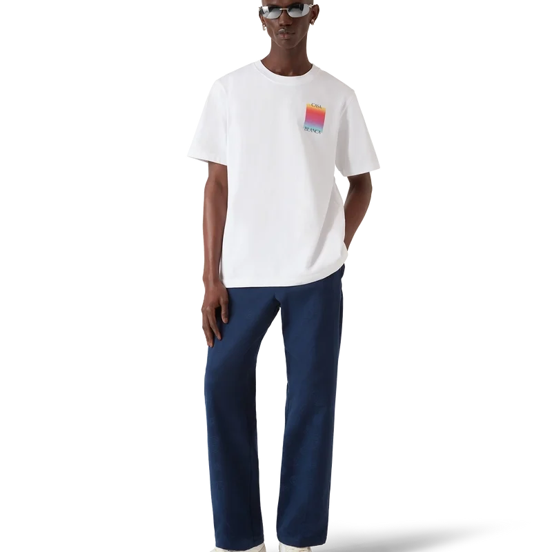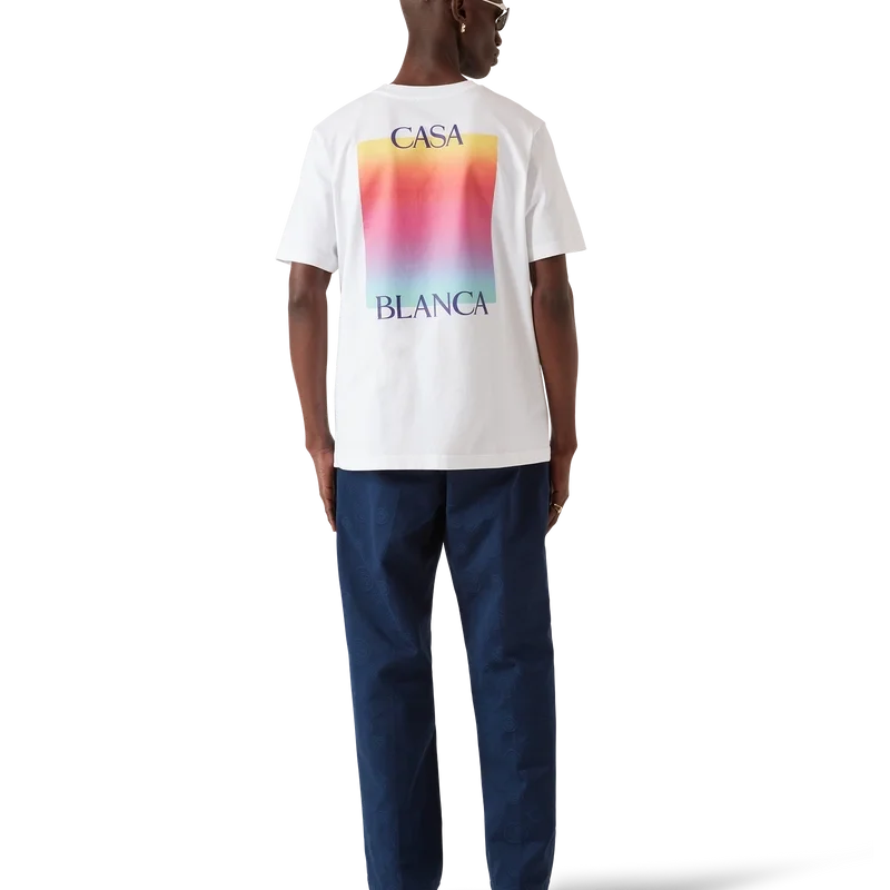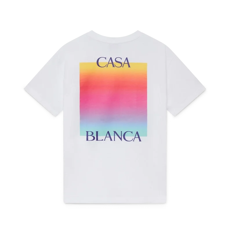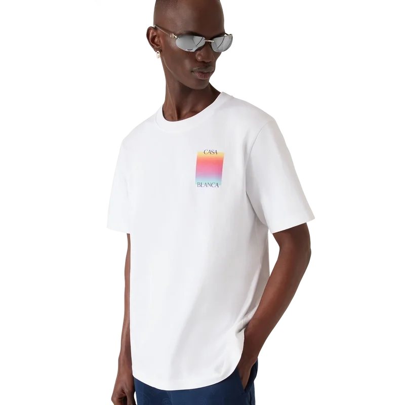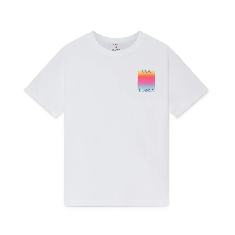 Das Kurzarm-T-Shirt mit Gradient-Quadrat-Logo ist ein Kurzarm-Modell mit dem gestapelten Logo des Hauses und dem saisonalen Gradient-Quadrat. Abgerundet durch einen klassischen Rundhalsausschnitt und eine lockere Silhouette.