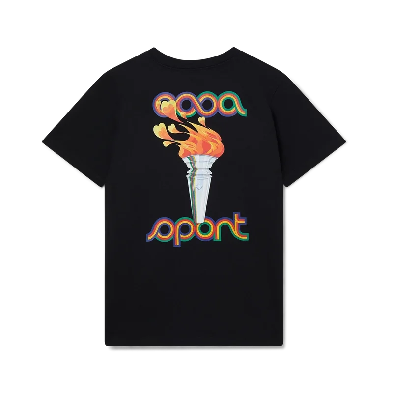 Das La Flamme Du Sport T-Shirt aus Bio-Baumwolle mit Siebdruck zeigt saisonale Motive, die die Ikonografie des Hauses aufgreifen. Mit klassischem Rundhalsausschnitt, kurzen Ärmeln und einem Casablanca Paris-Markenlabel, entworfen für eine lockere Passform.