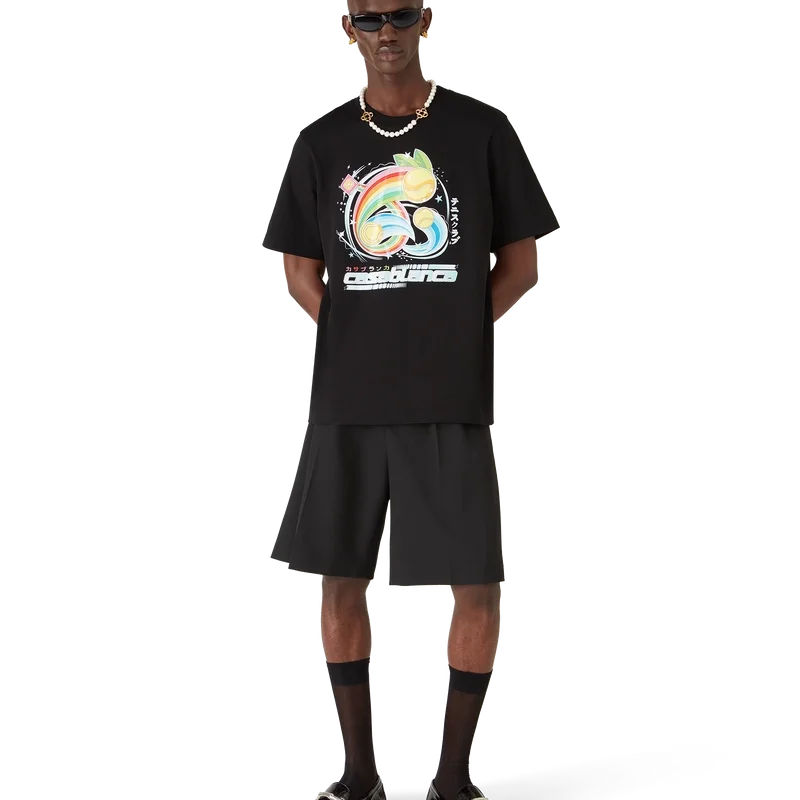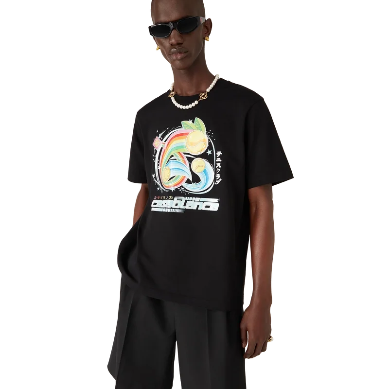Das Manga-Tennisball-T-Shirt ist ein kurzärmeliges Modell aus Bio-Baumwollstoff mit saisonalen Motiven, die weiterhin die Welt von Kawaii und Manga erkunden und mit der Ikonografie von Casablanca spielen, wobei Tennisbälle als Orangen verwendet werden – für einen lustigen Twist. Abgerundet durch einen klassischen Rundhalsausschnitt.