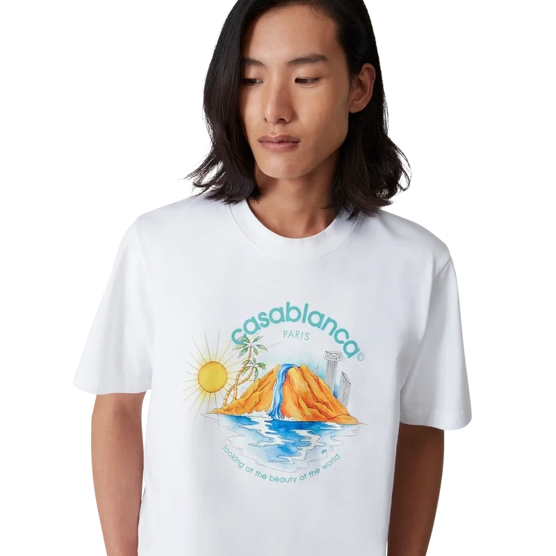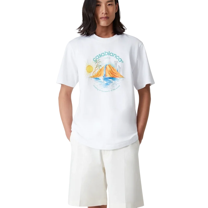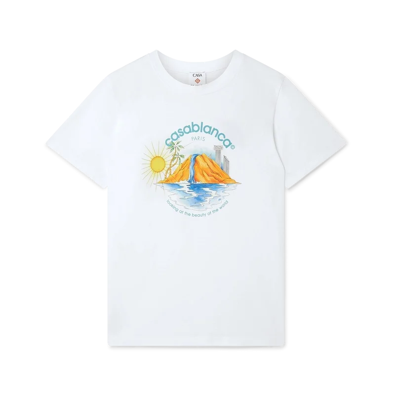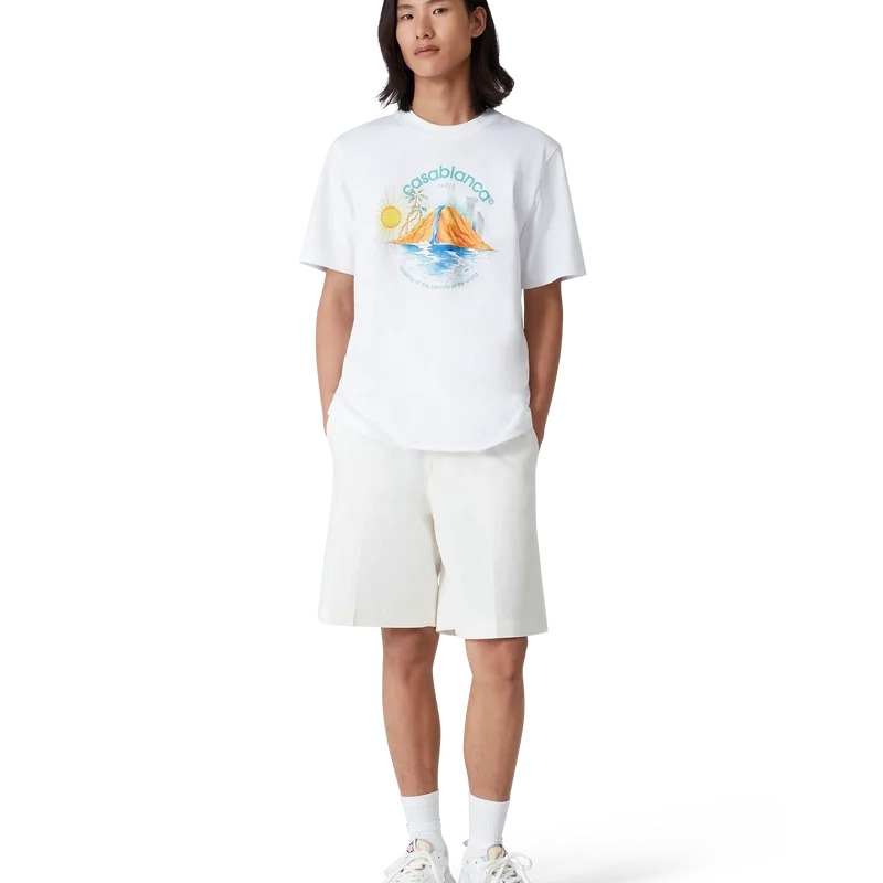 Das Oasis T-Shirt ist ein kurzärmeliges, bedrucktes Modell aus Bio-Baumwolle, das mit dem saisonalen Artwork des Hauses mit Designelementen aus Natur, Architektur und Tennis verziert ist. Abgerundet wird es durch einen klassischen Rundhalsausschnitt.