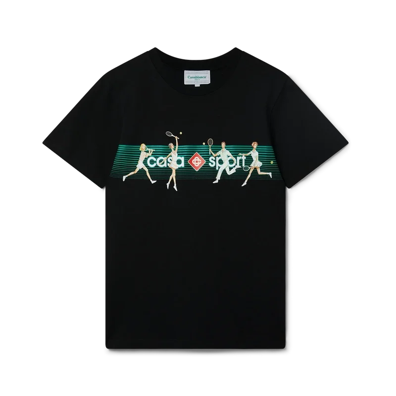 Das T-Shirt „Playful Stripes“ aus Bio-Baumwolle mit Siebdruck zeigt ein saisonales Motiv, das die charakteristischen Tennis- und Casa Sport-Symbole des Hauses vereint. Mit klassischem Rundhalsausschnitt, kurzen Ärmeln und Casablanca Paris-Markenlabel, entworfen für eine lockere Passform.