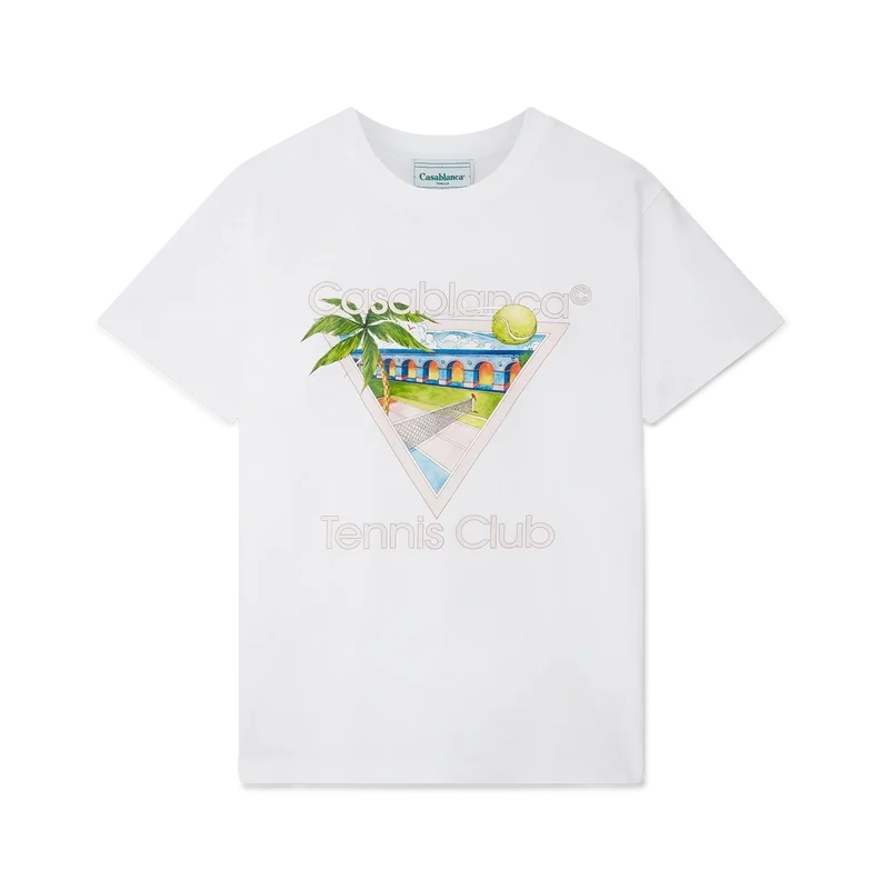 Das Tennis Club Icon T-Shirt ist ein siebgedrucktes Design mit dem charakteristischen Artwork des Hauses, das für diese Saison neu interpretiert wurde und Elemente aus Tennis, Natur und Architektur vereint. Es ist aus weißem Jersey gefertigt und verfügt über einen klassischen Rundhalsausschnitt sowie ein Casablanca-Markenlabel.