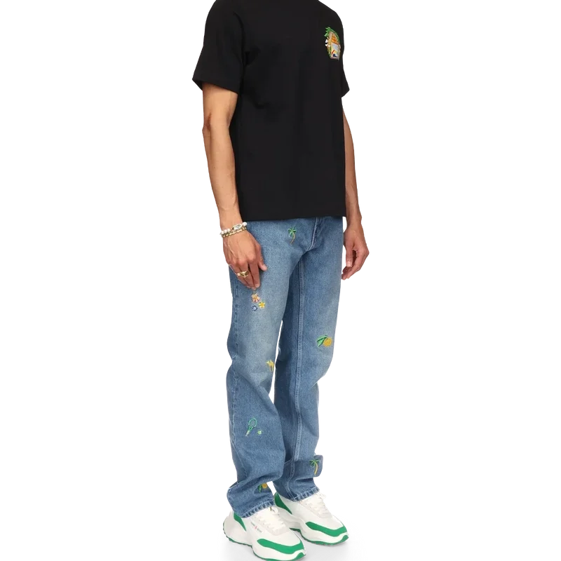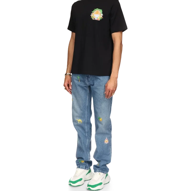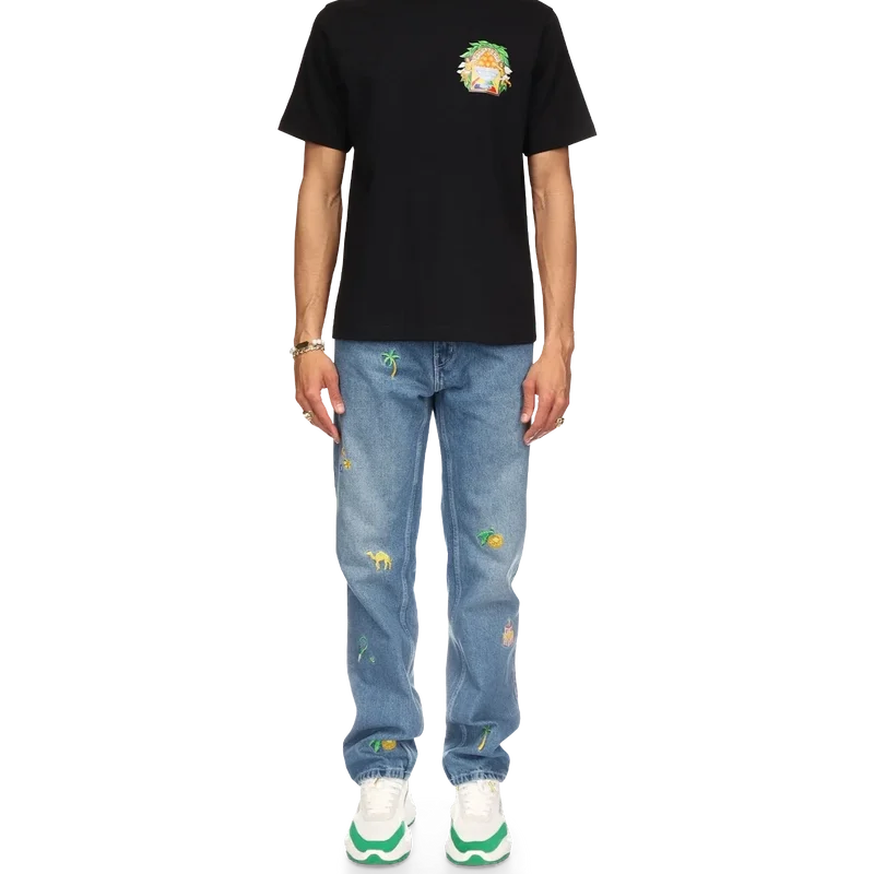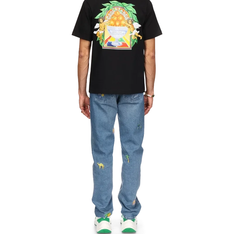 Das Triomphe D’orange T-Shirt zeigt einen Aufdruck des charakteristischen Hausmotivs, das Tennis und unsere orangefarbene Pyramide vereint, die auf der Rückseite in einem größeren Aufdruck wiederholt wird. Es ist aus schwarzem Jersey gefertigt und verfügt über einen klassischen Rundhalsausschnitt sowie ein Casablanca-Markenlabel.