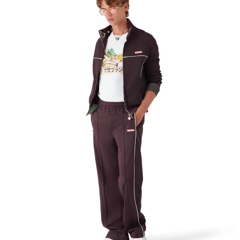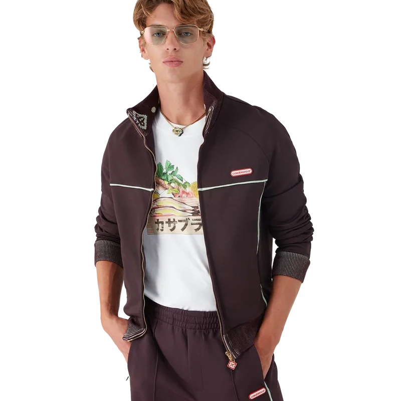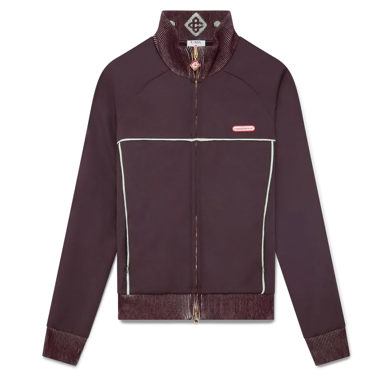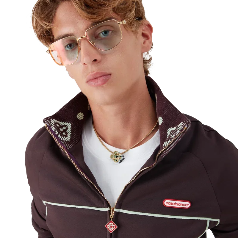 Die Tricot-Trainingsjacke ist ein langärmeliges Modell mit dem Casablanca-Logo-Patch des Hauses. Ausgestattet mit einem Reißverschluss mit charakteristischer Reißverschlusslasche mit Diamond Monogram, mintfarbenen Paspeldetails an Brust, Rücken und Vorderseite, Eingrifftaschen mit Reißverschluss, einem Casablanca-Logo unterhalb der Passe – in japanischer Schrift, gerippten Bündchen und Saum sowie einem Trichterkragen mit dem charakteristischen ineinander verschlungenen CC-Monogramm.